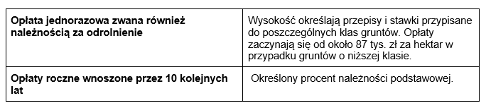 Wysokość opłat zależy bezpośrednio od klasy bonitacyjnej gruntu oraz powierzchni, która ma zostać przeznaczona pod zabudowę. Ustawodawca przewidział dwuetapową strukturę kosztów obejmującą zarówno opłatę początkową, jak i wieloletnie obciążenie finansowe.