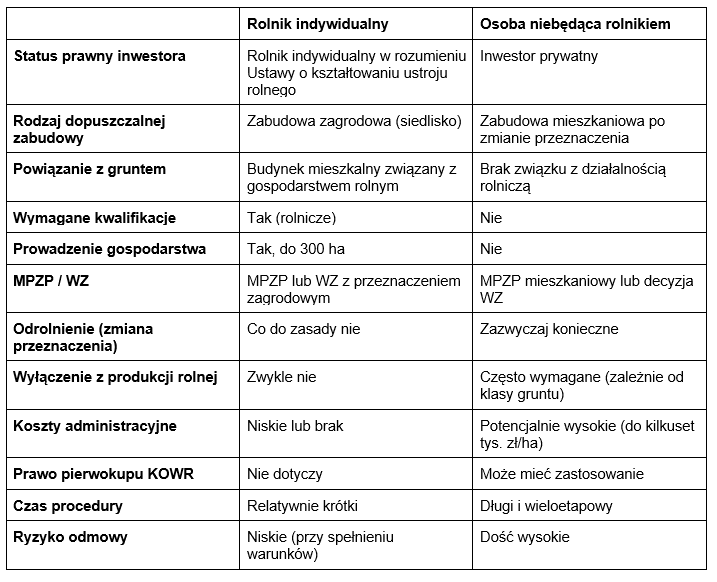 Aby lepiej zobrazować, czym różni się procedura budowy domu dla rolników i nie-rolników, przygotowaliśmy tabelę: