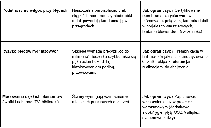 - źle zaprojektowane wzmocnienia pod ciężkie elementy (później problem z montażem kuchni czy półek),