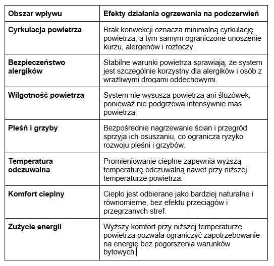 Technologia podczerwieni nie wywołuje konwekcji, czyli cyrkulacji nagrzanego powietrza. Ogrzane ściany, podłogi i przedmioty pełnią rolę naturalnych akumulatorów ciepła, powoli oddając energię do otoczenia. W ogrzewaniu domowym najczęściej stosuje się IR-C (fale długofalowe), które są bezpieczne dla ludzi.