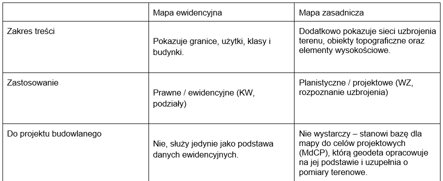 Podstawą do wykonania mapy do celów projektowych jest mapa zasadnicza (link: Mapa zasadnicza - co zawiera i kiedy jest wymagana?), która zawiera dane o sieciach uzbrojenia terenu, ukształtowaniu powierzchni i granicach ewidencyjnych. W odróżnieniu od niej mapa do celów projektowych zawiera zaktualizowane dane terenowe, które uwzględniają rzeczywisty stan działki i jej otoczenia. Geodeta wykonuje niezbędne pomiary w terenie, weryfikuje przebieg sieci uzbrojenia, granice i ukształtowanie terenu, a następnie opracowuje mapę potwierdzoną tzw. klauzulą urzędową (czyli przyjęciem operatu technicznego do PZGiK). Mapa do celów projektowych stanowi podkład dla projektu zagospodarowania działki lub terenu (PZDT), który wchodzi w skład projektu architektoniczno-budowlanego (PAB) dołączanego do wniosku o pozwolenie na budowę.