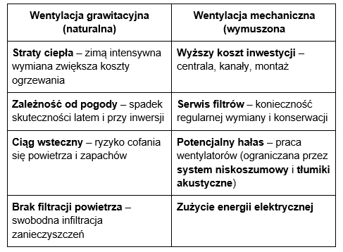Wentylacja grawitacyjna działa w oparciu o zjawiska fizyczne, zaś wentylacja mechaniczna opiera się na pracy wentylatorów. Aby lepiej zobrazować różnice, opracowaliśmy tabelę porównawczą.