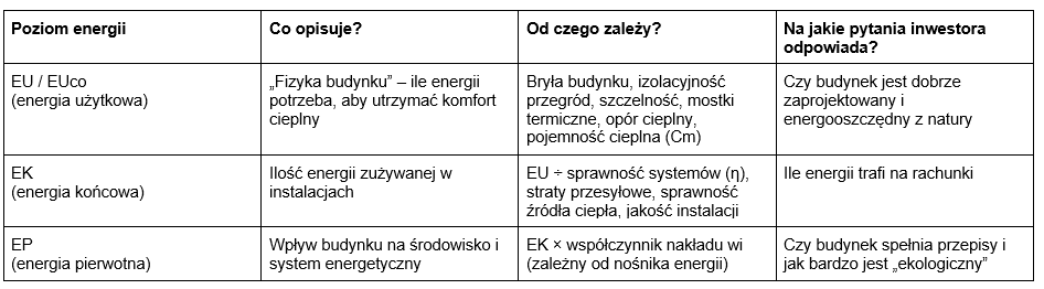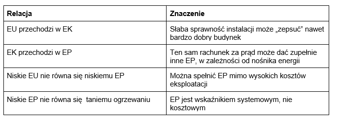 EK mówi o kosztach eksploatacji, EUco o jakości budynku, a EP o jego wpływie na środowisko i zgodności z wymaganiami prawa.