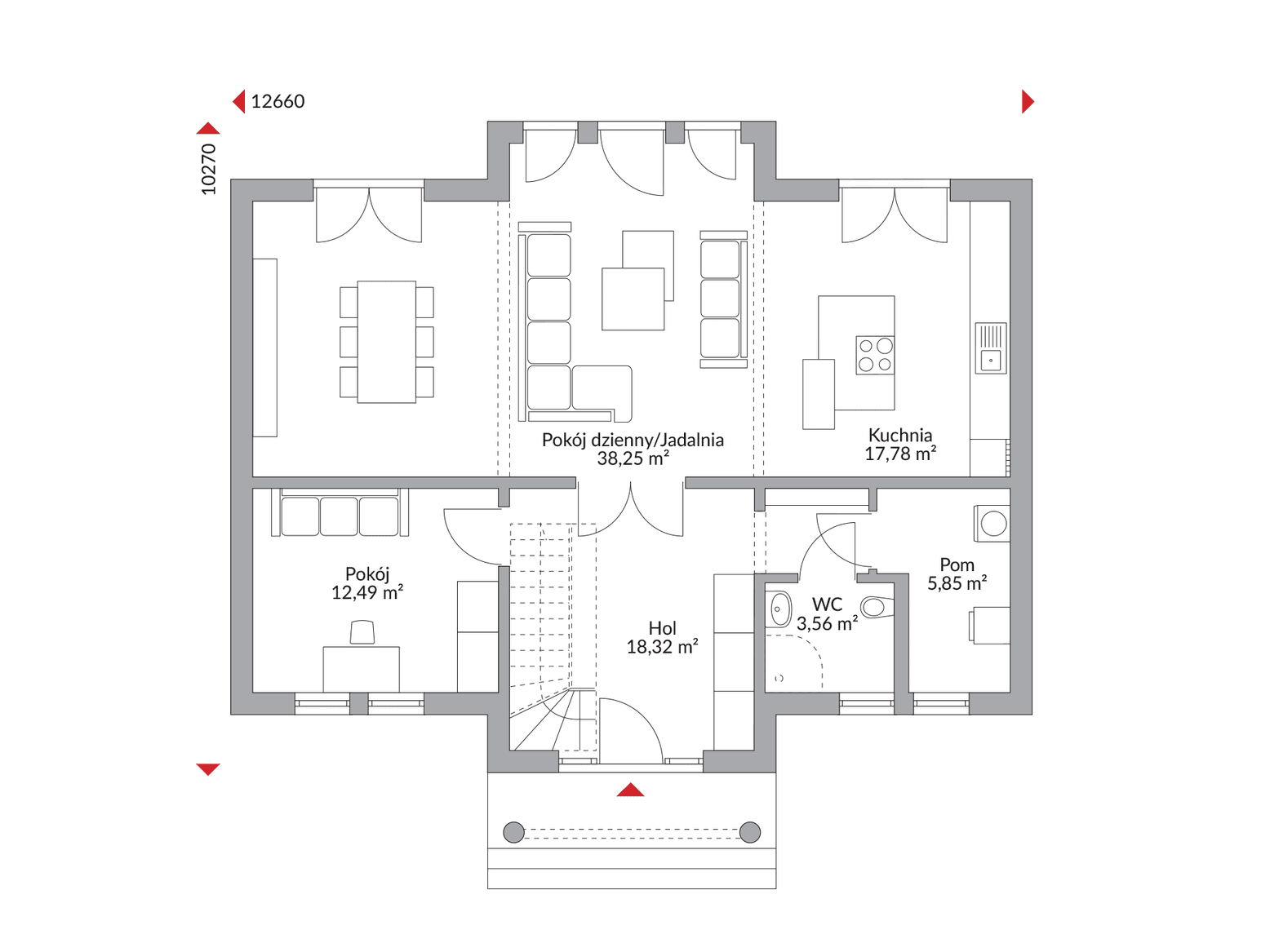 Na parterze sercem domu jest obszerna, otwarta strefa dzienna, gdzie salon płynnie łączy się z jadalnią, tworząc idealne miejsce do wspólnego spędzania czasu i rodzinnych uroczystości. Otwarta kuchnia sprzyja integracji i kulinarnym eksperymentom, a całość uzupełniają praktyczna toaleta dla gości oraz niezbędne pomieszczenie techniczne.