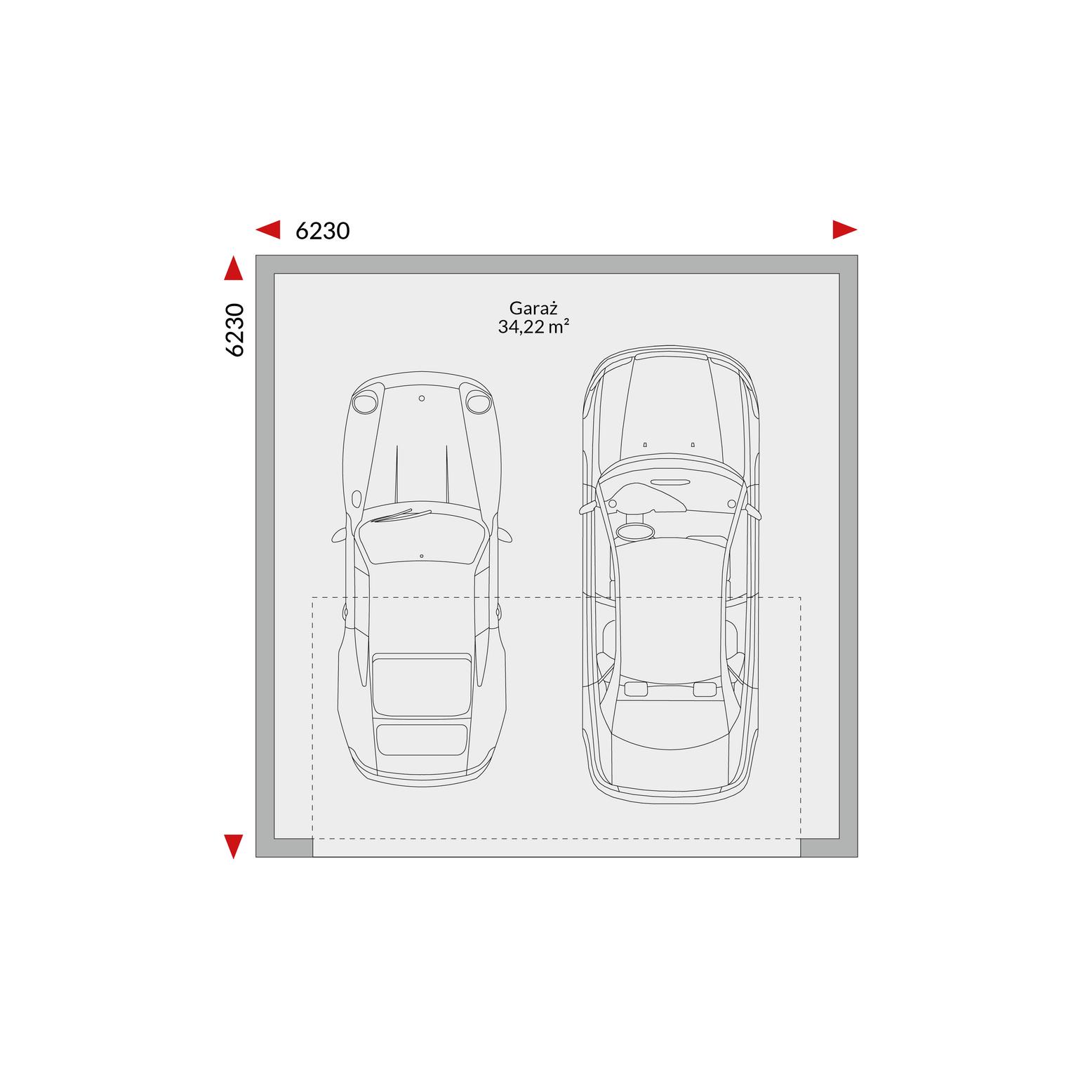 Garaż DG-F - garaż dwustanowiskowy, dach płaski 6,23 m x 6,23 m (wymiary zewnętrzne).
