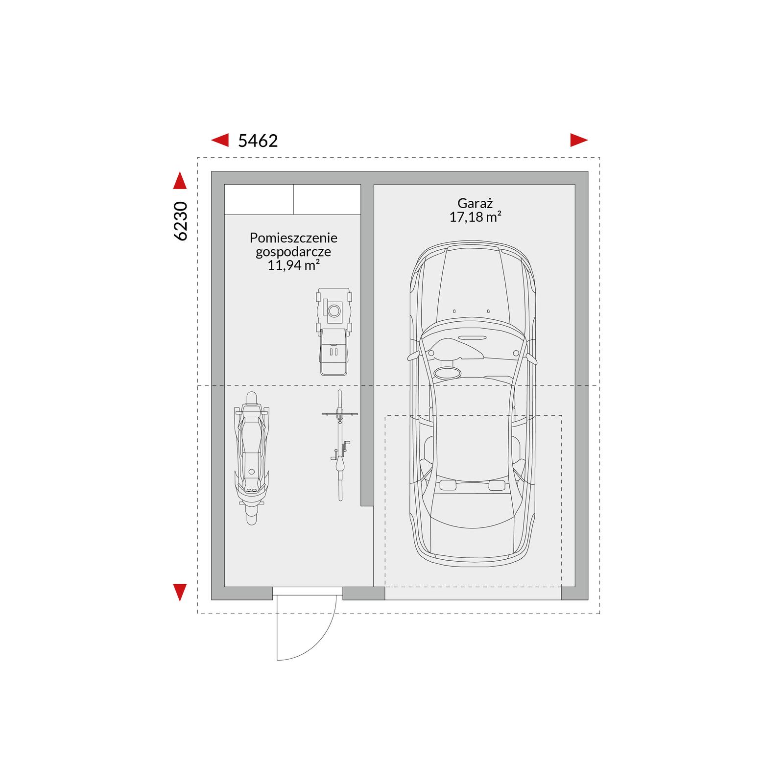 Garaż EG-STA - garaż jednostanowiskowy z pomieszczeniem gospodarczym, dach dwuspadowy, wjazd od okapu 5,462 m x 6,23 m (wymiary zewnętrzne).