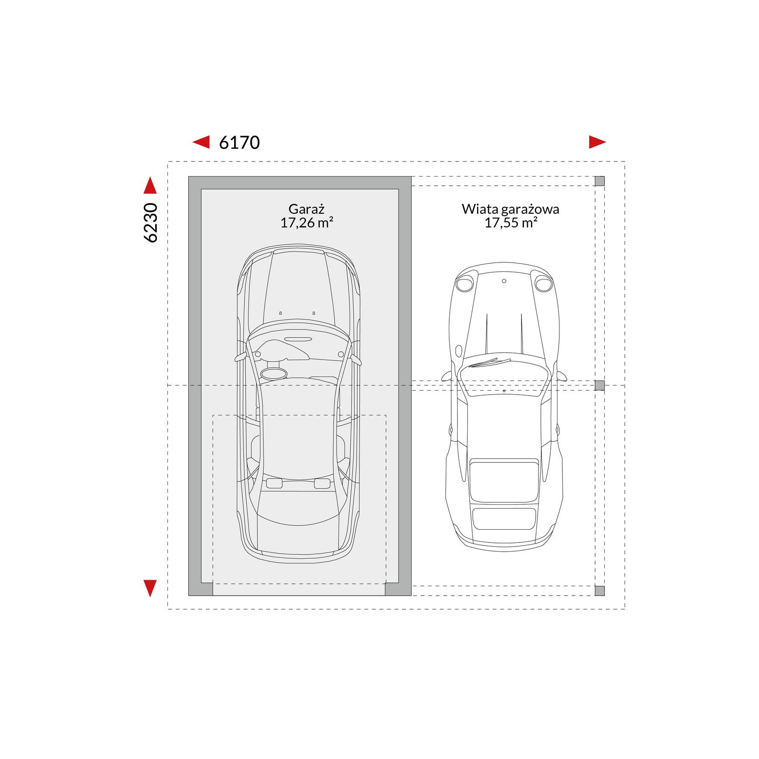 Garaż EG-STC - garaż z dachem dwuspadowym, wjazd od okapu 6,17 m x 6,23 m (wymiary zewnętrzne).