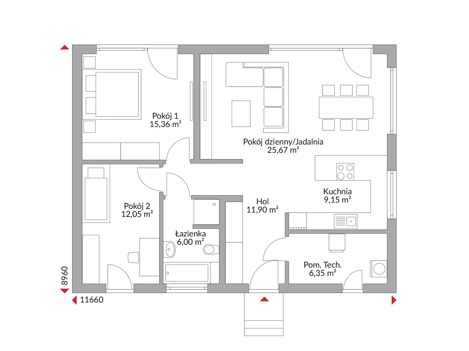 Sercem tego uroczego małego domu parterowego jest jasny, otwarty salon połączony z jadalnią oraz funkcjonalną kuchnią. Ta przemyślana strefa dzienna, mimo kompaktowych wymiarów, oferuje wszystko, co potrzebne do komfortowego życia i przyjmowania gości. Dom Perfect 86 posiada dwa przytulne pokoje (łącznie trzy pokoje), które idealnie sprawdzą się jako sypialnia i gabinet lub pokój dla dziecka. Całość dopełniają dobrze rozplanowana łazienka oraz praktyczne pomieszczenie techniczne.