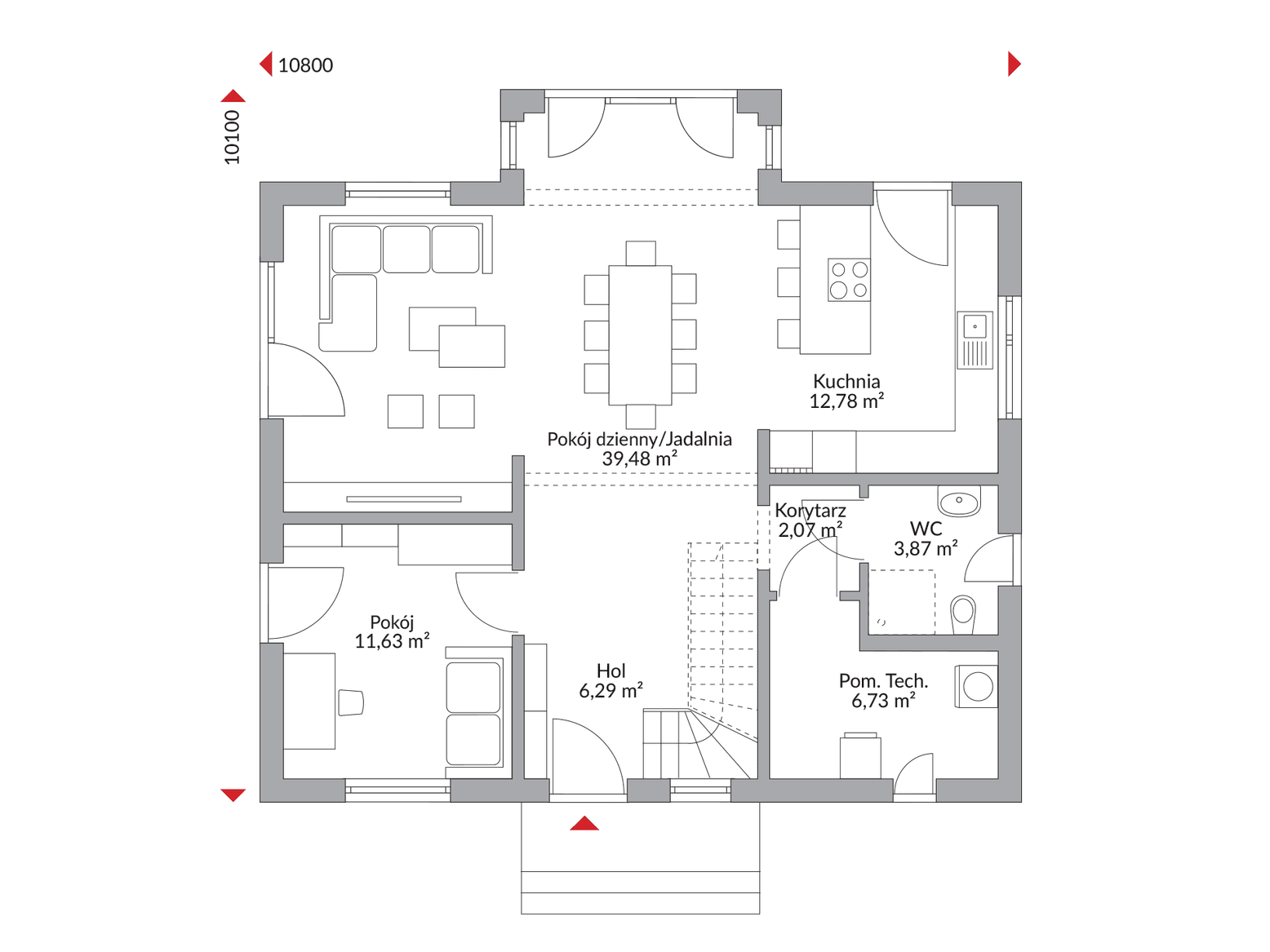 Parter domu Point 165 wita Cię przestronnym holem i korytarzem. Sercem domu jest jasna, otwarta kuchnia, która naturalnie łączy się z obszernym salonem i jadalnią, dodatkowo powiększonymi przez efektowny wykusz, tworząc idealne miejsce do wspólnego życia i przyjmowania gości. Funkcjonalność tego poziomu podkreślają również wygodna toaleta dla gości oraz niezbędne pomieszczenie techniczne.