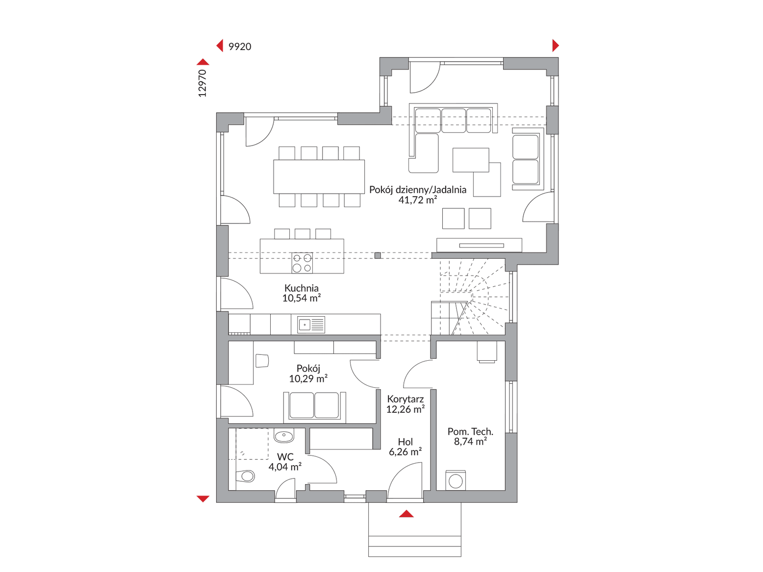 Parter domu Point 174.1 wita Cię przestronnym holem i korytarzem. Sercem domu jest jasna, otwarta kuchnia, która naturalnie łączy się z obszernym salonem i jadalnią, tworząc idealne miejsce do wspólnego życia, przyjmowania gości i celebrowania każdej chwili. Funkcjonalność tego poziomu podkreślają również wygodna toaleta dla gości oraz niezbędne pomieszczenie techniczne.