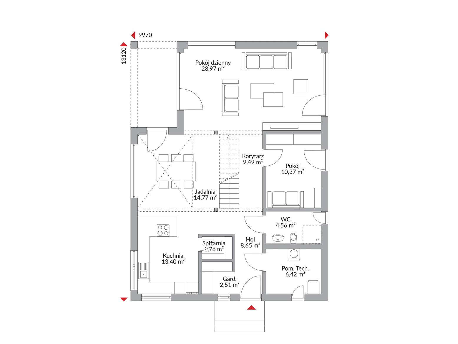 Poddasze użytkowe oferuje pełnowymiarową przestrzeń z aż sześcioma pokojami, które możesz zaaranżować według własnych potrzeb. Dwie komfortowe łazienki na obu kondygnacjach zapewniają wygodę wszystkim domownikom.