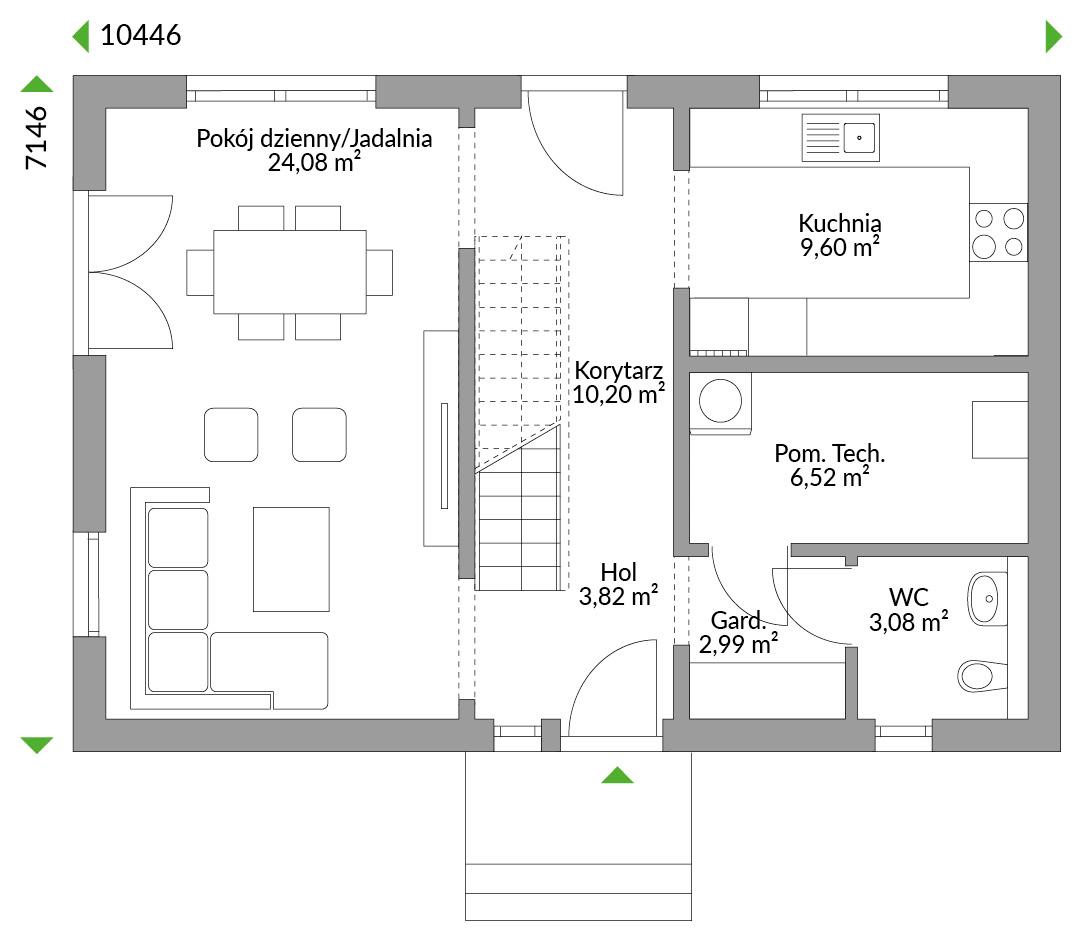 Maksimum treści na minimalnej powierzchni oto wyzwanie dla kreatywnych inwestorów, czyli dom Family 120. Choć powierzchnia jego zabudowy jest niewielka, to przestrzeń mieszkalna na dwóch pełnych kondygnacjach obszerna i komfortowa. Pełna wysokość pomieszczeń na górnej kondygnacji oraz przestronny hol na parterze dają duże możliwości aranżacyjne.