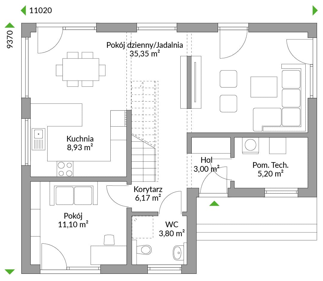 Dwie pełne kondygnacje dla rodziny, która ceni sobie komfort i oczekuje sporej przestrzeni. Na parterze oprócz sporego salonu połączonego z otwartą kuchnią oraz łazienką przewidzieliśmy także dodatkowy pokój, który może być wykorzystany jako gabinet bądź pokój dla gości. Piętro to duża sypialni rodziców z własną garderobą, obszerna rodzinna łazienka oraz dwie sypialnie przeznaczone dla dzieci.