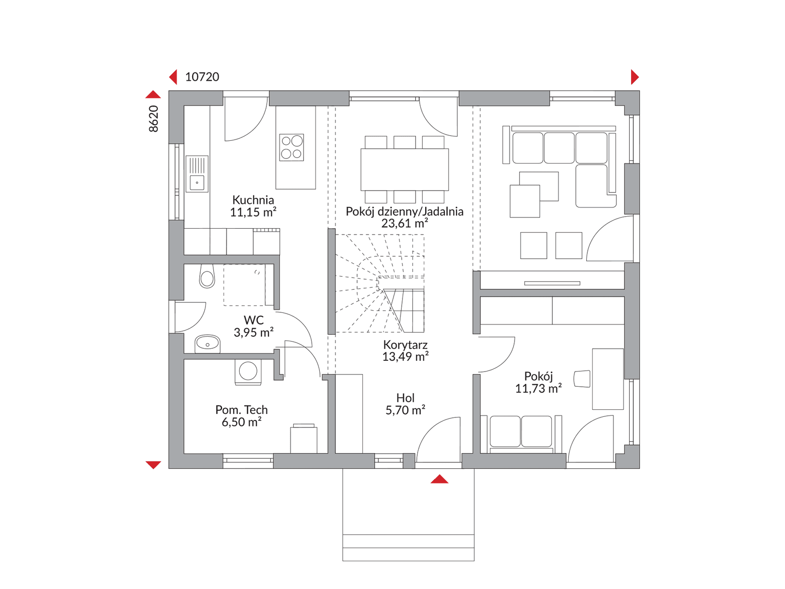 Parter wita Cię przestronnym holem z praktyczną szatnią, prowadzącym wprost do serca domu: olśniewającej, otwartej strefy dziennej. Tu salon, jadalnia i kuchnia łączą się w jedną, pełną światła przestrzeń, gdzie życie rodzinne kwitnie, a spotkania z przyjaciółmi nabierają wyjątkowego charakteru. Wygodna toaleta dla gości i niezbędne pomieszczenie techniczne dopełniają funkcjonalności tego poziomu.