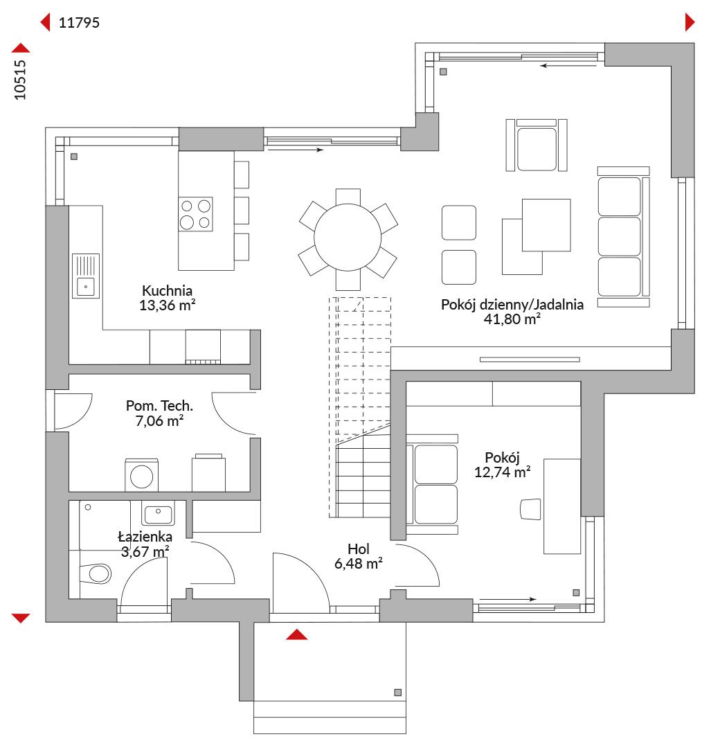 Dom dwukondygnacyjny z zadaszonym wejściem i podwyższonymi drzwiami. Trzy pokoje na piętrze. Główna sypialnia z garderobą i bezpośrednim dostępem do łazienki z wanną, podwójną umywalką i prysznicem. Podwyższony parter z wykuszem narożnym i wyższymi oknami jako otwarta kuchnia (również z narożnym przeszkleniem), salon i jadalnia z drzwiami przesuwnymi na taras. Toaleta dla gości, pomieszczenie techniczne, hol i korytarz. Dach kopertowy z szerokim okapem (60 cm), nachylenie 22°.