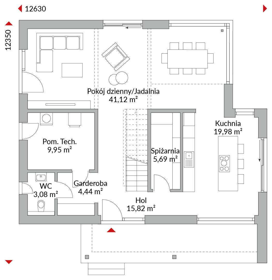 Dom dwukondygnacyjny z szerokim zadaszeniem wejściowym typu attyka i prostym wykuszem narożnym. Trzy pokoje na piętrze, antresola, przestronny korytarz. Główna sypialnia z łazienką en suite z prysznicem i garderobą. Dodatkowa łazienka z wolnostojącą wanną i prysznicem. Podwyższony parter z narożnym przeszkleniem w części jadalnej i wyższymi oknami jako otwarta kuchnia, salon i jadalnia z wyjściem na taras. Osobna spiżarnia. Toaleta dla gości, pomieszczenie techniczne, hol. Dach kopertowy z szerokim okapem (60 cm), nachylenie 22°.