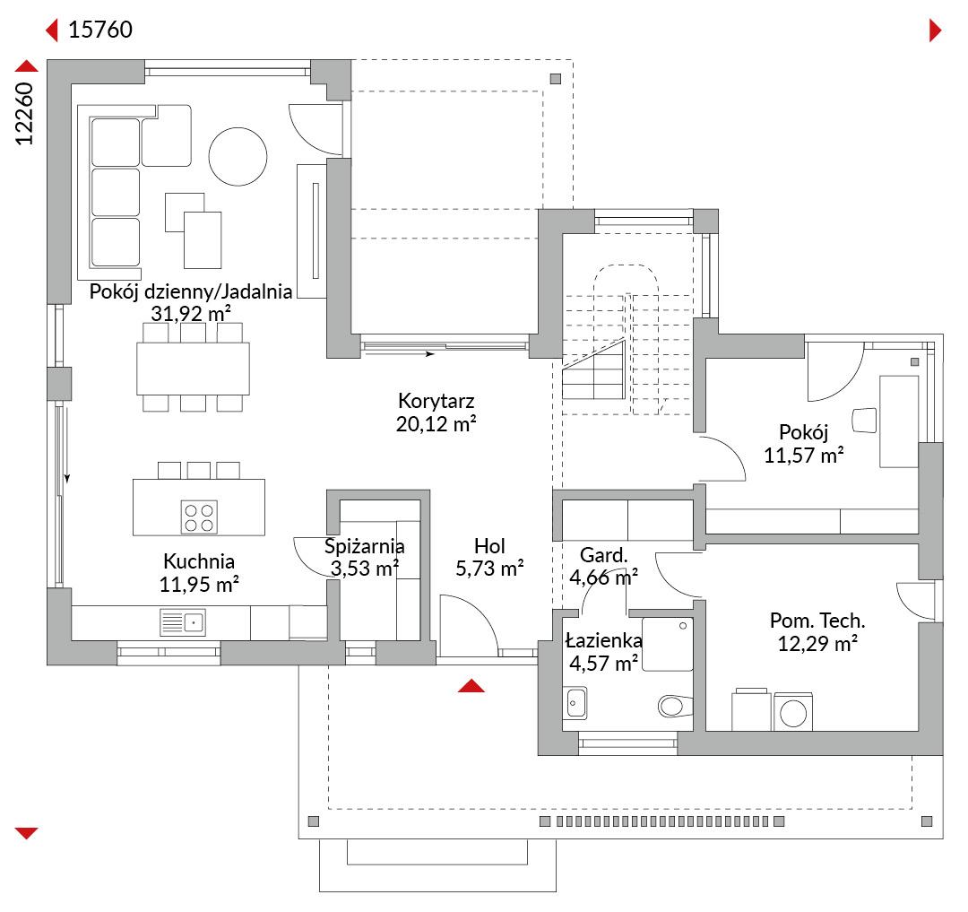 Dom dwukondygnacyjny z szerokim zadaszeniem wejściowym typu attyka i prostym wykuszem narożnym. Częściowo zadaszony taras dzięki wysunięciu dachu. Trzy pokoje na piętrze, korytarz. Główna sypialnia z łazienką en suite z wolnostojącą wanną, prysznicem, podwójną umywalką i osobną garderobą. Dodatkowa łazienka z prysznicem. Podwyższony parter z wyższymi oknami jako otwarta kuchnia, salon i jadalnia z drzwiami przesuwnymi na taras. Osobna spiżarnia. Toaleta dla gości, pomieszczenie techniczne, hol z garderobą. Dach dwuspadowy bez okapów, nachylenie 35°.
