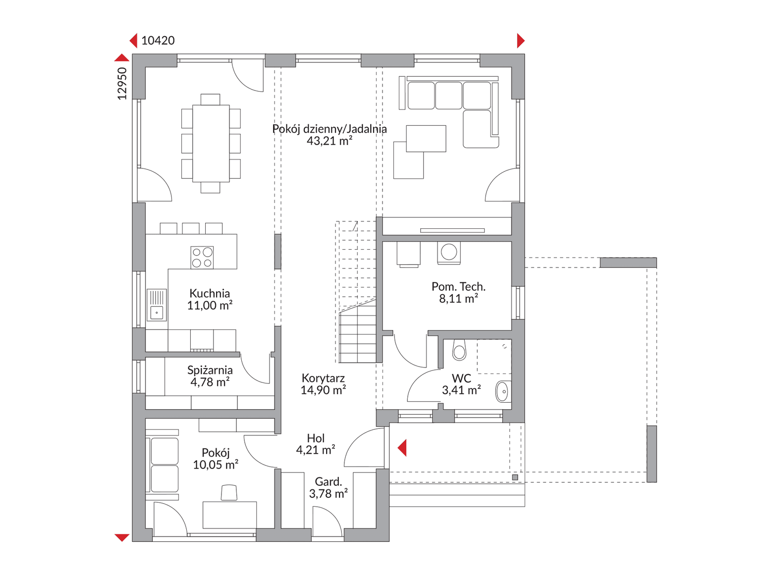 Na parterze wita Cię imponująca, otwarta strefa dzienna, gdzie przestronny salon i jadalnia tworzą idealne miejsce do wspólnego życia i przyjmowania gości. Otwarta kuchnia, być może z praktyczną spiżarnią tuż obok, stanie się sercem Twoich kulinarnych inspiracji. Całość parteru uzupełniają niezbędna toaleta dla gości oraz funkcjonalne pomieszczenie techniczne.
