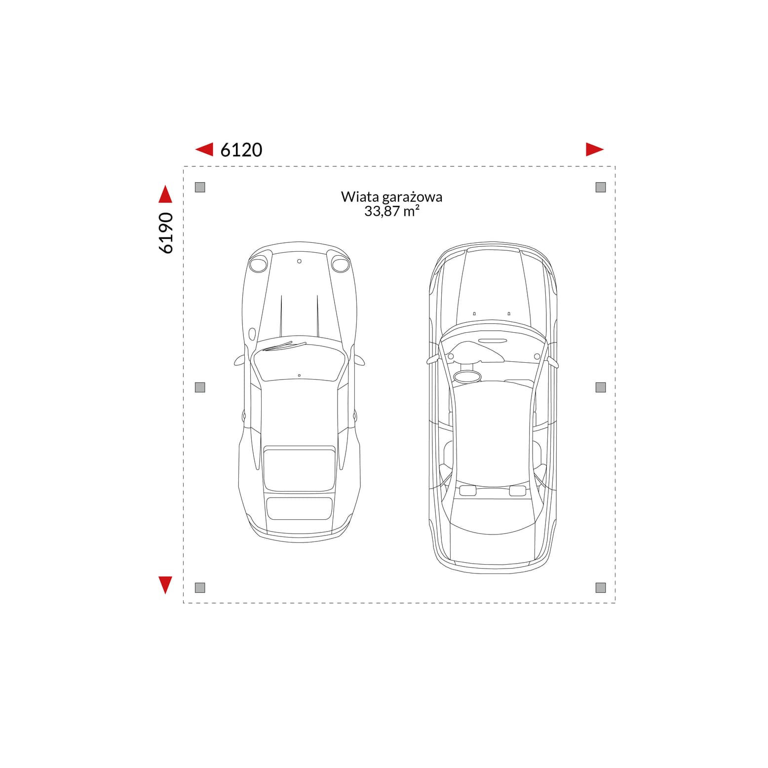 Wiata garażowa DC-P - wiata garażowa dwustanowiskowa, dach jednospadowy 5,82 m x 5,82 m (wymiary zewnętrzne).