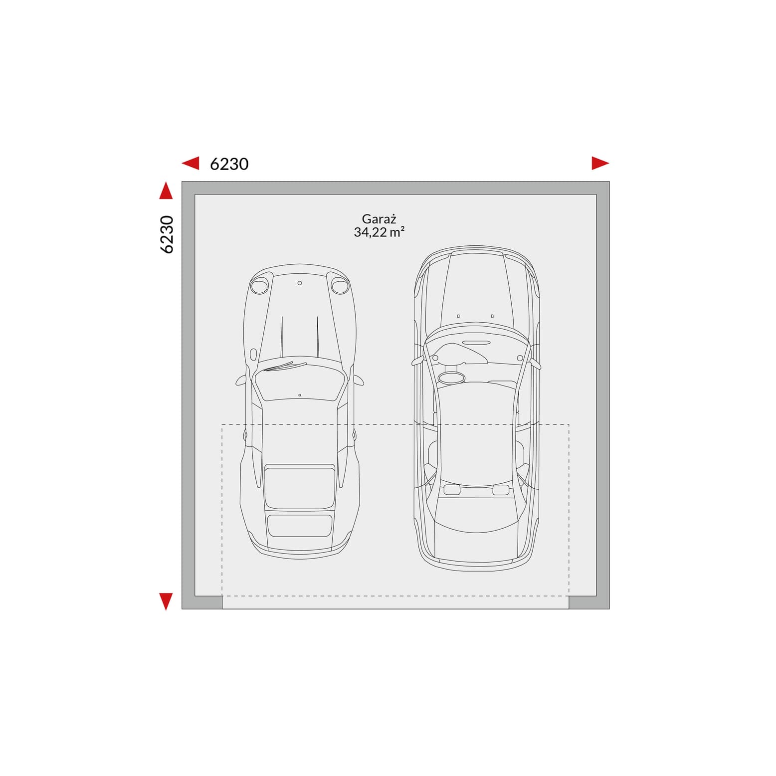 Garaż DG-F - garaż dwustanowiskowy, dach płaski 6,23 m x 6,23 m (wymiary zewnętrzne).
