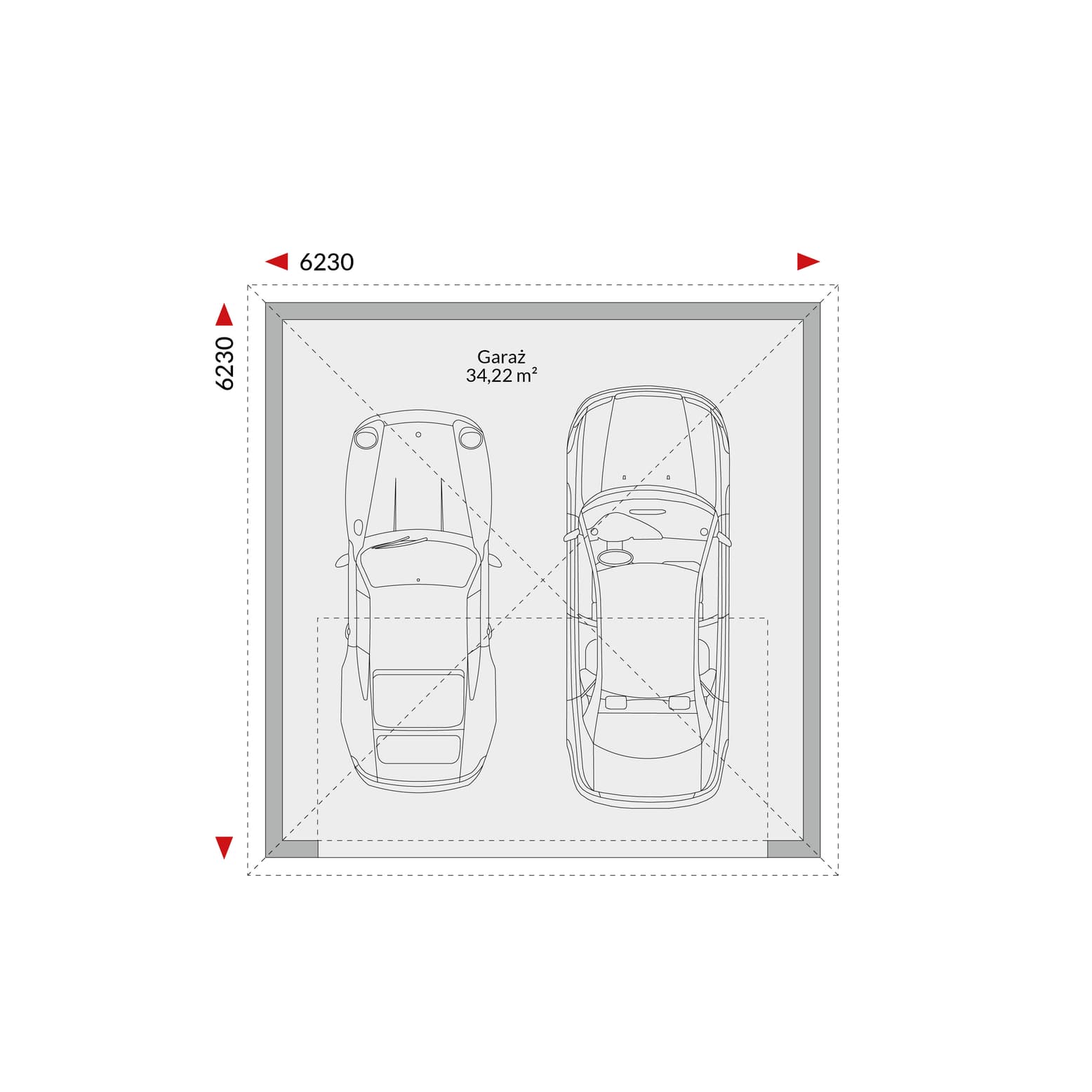 Garaż DG-W - garaż dwustanowiskowy, dach czterospadowy 6,23 m x 6,23 m (wymiary zewnętrzne).