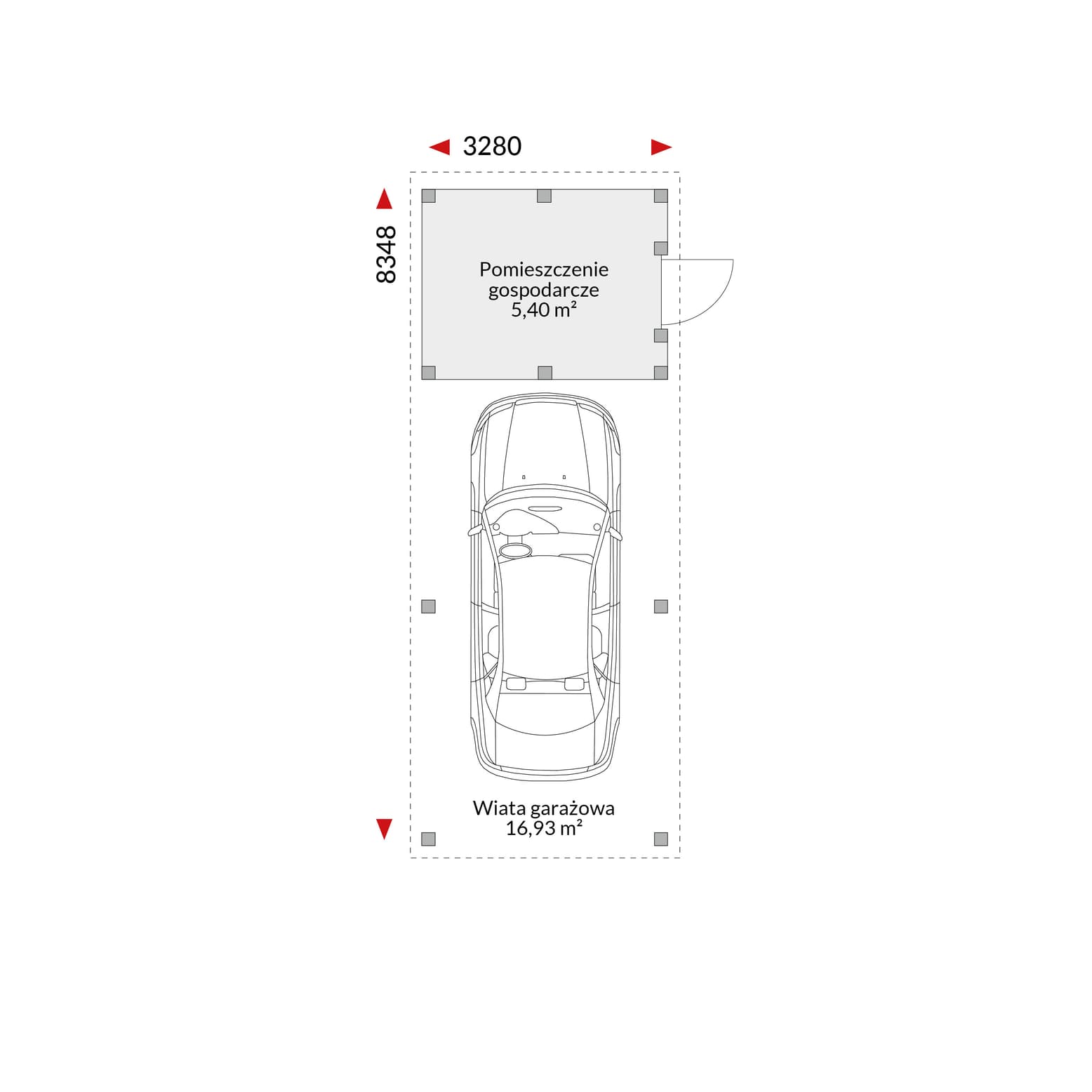Model EC-PA to więcej niż tylko zadaszone miejsce parkingowe – to inteligentne połączenie wiaty na jeden samochód z praktycznym, zamykanym pomieszczeniem gospodarczym. Idealne na rowery, narzędzia, opony sezonowe czy sprzęt ogrodowy! Mimo kompaktowych wymiarów zewnętrznych (3,016 m x 7,996 m) i powierzchni podłóg 22,33 m², EC-PA maksymalizuje użyteczność każdego metra.