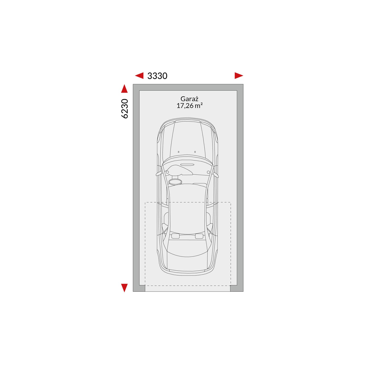 Garaż EG-F - garaż jednostanowiskowy, dach płaski, 3,33 m x 6,23 m (wymiary zewnętrzne).