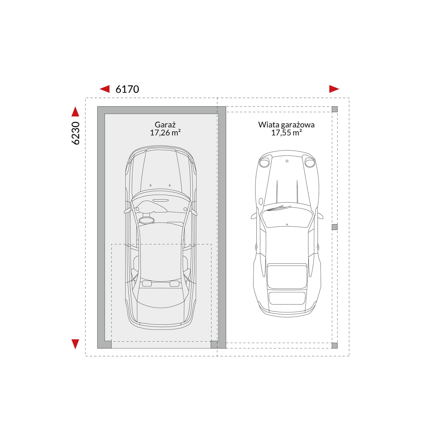 Garaż EG-SGC - garaż z dachem dwuspadowym, wjazd od szczytu 6,17 m x 6,23 m (wymiary zewnętrzne).