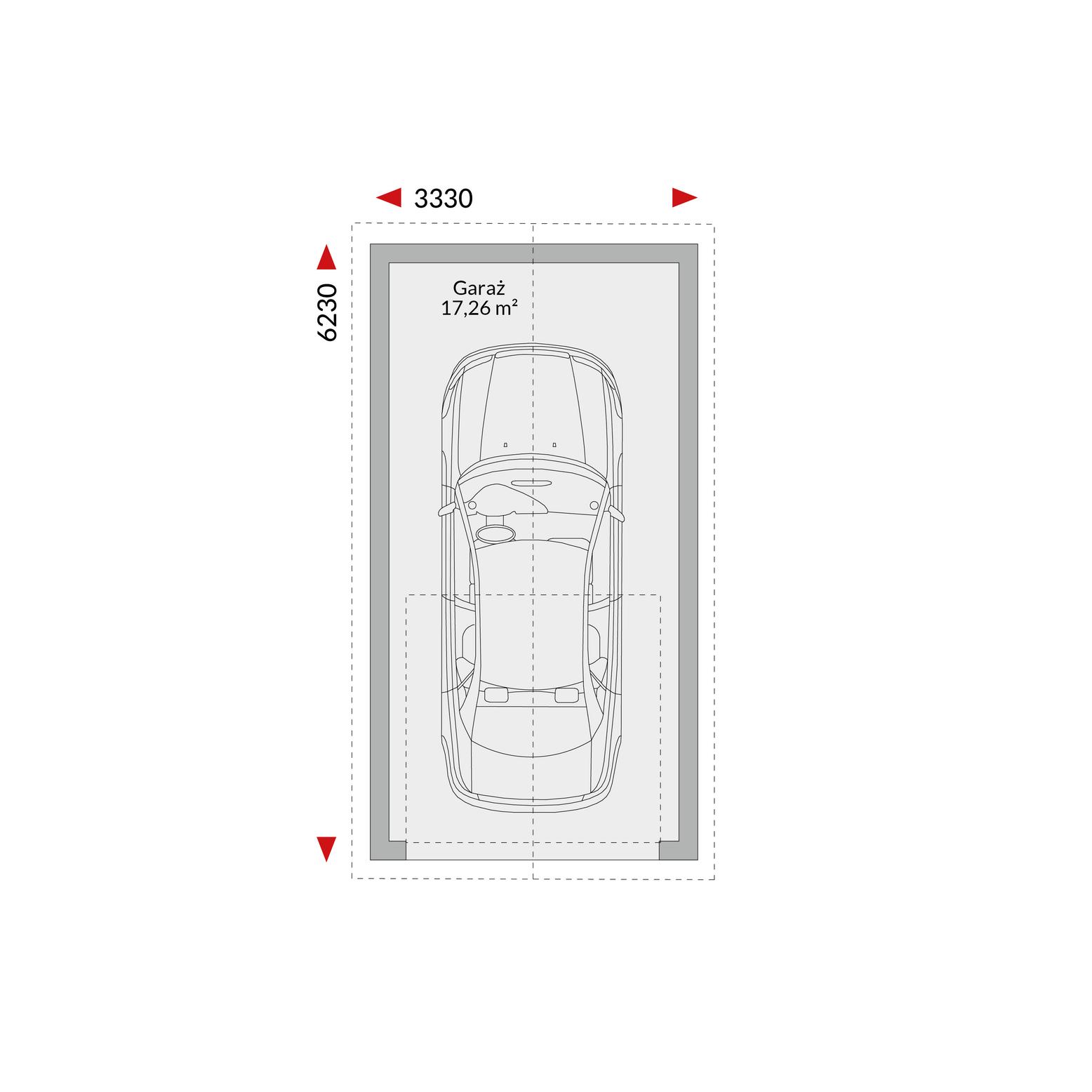 Garaż EG-STG - garaż jednostanowiskowy, dach dwuspadowy, wjazd od szczytu 3,33 m x 6,23 m (wymiary zewnętrzne).