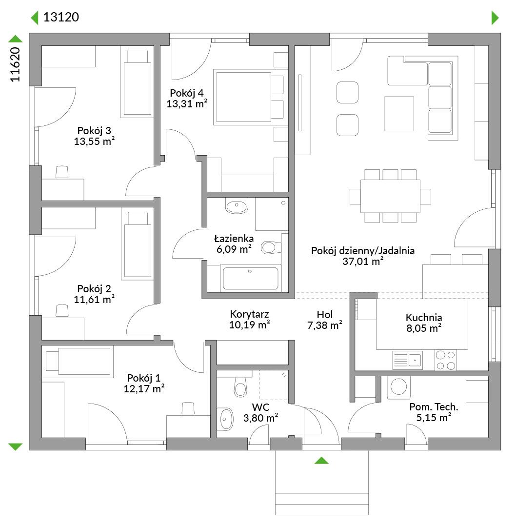W tym domu każdy znajdzie swoje miejsce - zaprojektowaliśmy w nim, aż 4 sypialnie. Przestronny salon połączony z kuchnią i jadalnią zachwyci dużymi oknami tarasowymi, które wpuszczają dużo światła i otwierają przestrzeń na ogród.
