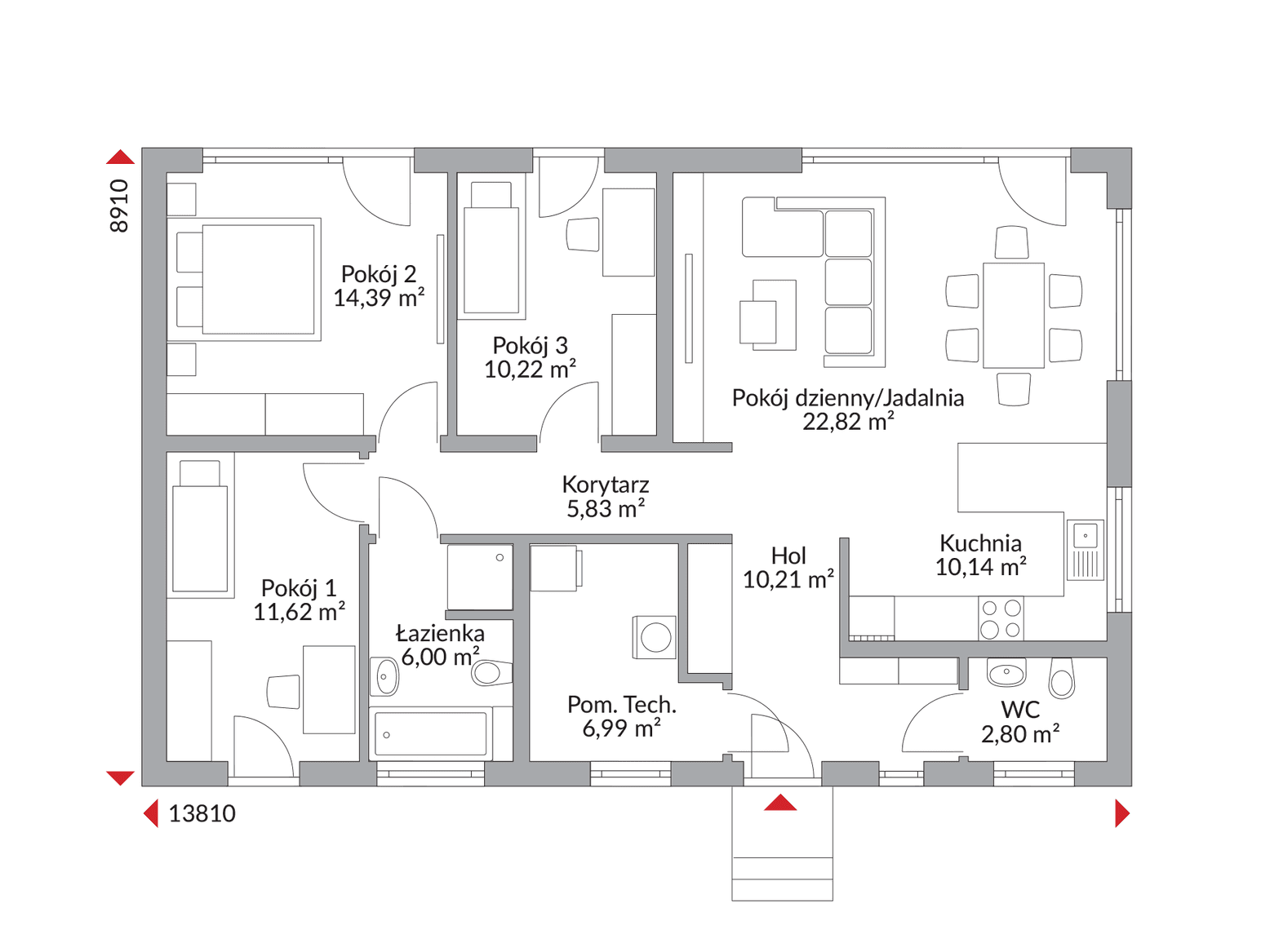 Wyobraź sobie przestronny, otwarty salon połączony z jadalnią i kuchnią, tworzący serce domu, idealne do wspólnego spędzania czasu. Trzy przytulne pokoje dają swobodę aranżacji – czy to jako sypialnie, gabinet czy pokój gościnny – a funkcjonalna łazienka i praktyczne pomieszczenie techniczne dopełniają całości, zapewniając komfort na co dzień. To idealne rozwiązanie dla osób ceniących dostępność i bliskość natury, z łatwym dostępem do ogrodu z każdego zakątka.