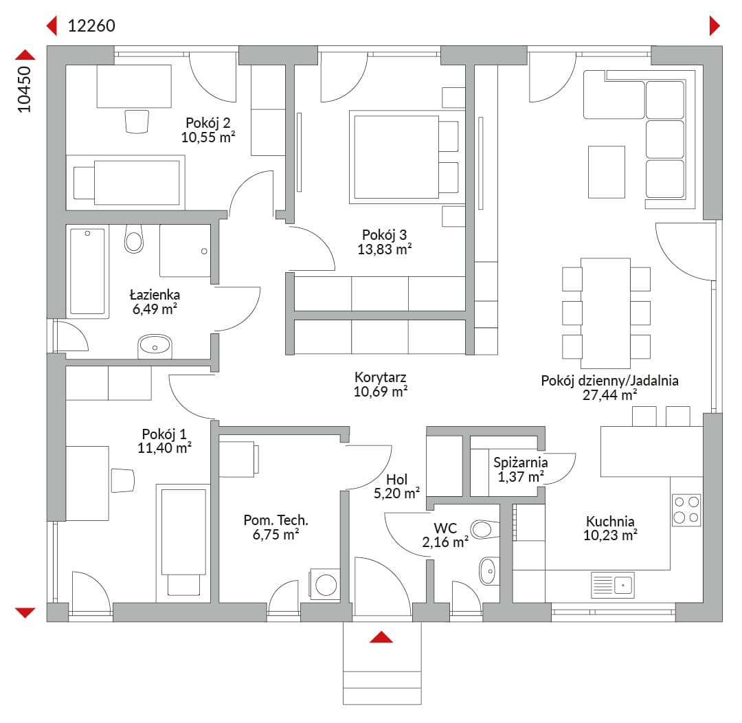 Perfect 106 stawia na komfort życia bez schodów oraz układ pomieszczeń ograniczający codzienne przemieszczanie się. Centralna strefa dzienna z jadalnią sprawia wrażenie otwartej i oferuje miejsce na duży stół, spotkania z bliskimi i spokojne wieczory.