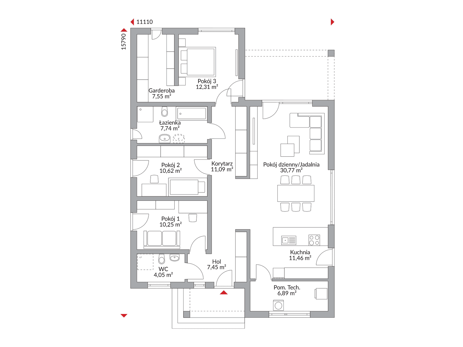 Sercem domu jest imponująca, otwarta strefa dzienna, gdzie salon, jadalnia i kuchnia tworzą harmonijną całość – idealne miejsce do spędzania czasu z rodziną i przyjaciółmi. Duże przeszklenia wpuszczają mnóstwo naturalnego światła, potęgując wrażenie przestronności. Oprócz tej zachwycającej przestrzeni, Perfect 120.1 oferuje trzy komfortowe pokoje, które możesz zaaranżować według własnych potrzeb – jako sypialnie, gabinet czy pokój hobby – oraz funkcjonalną łazienkę i niezbędne pomieszczenie techniczne.