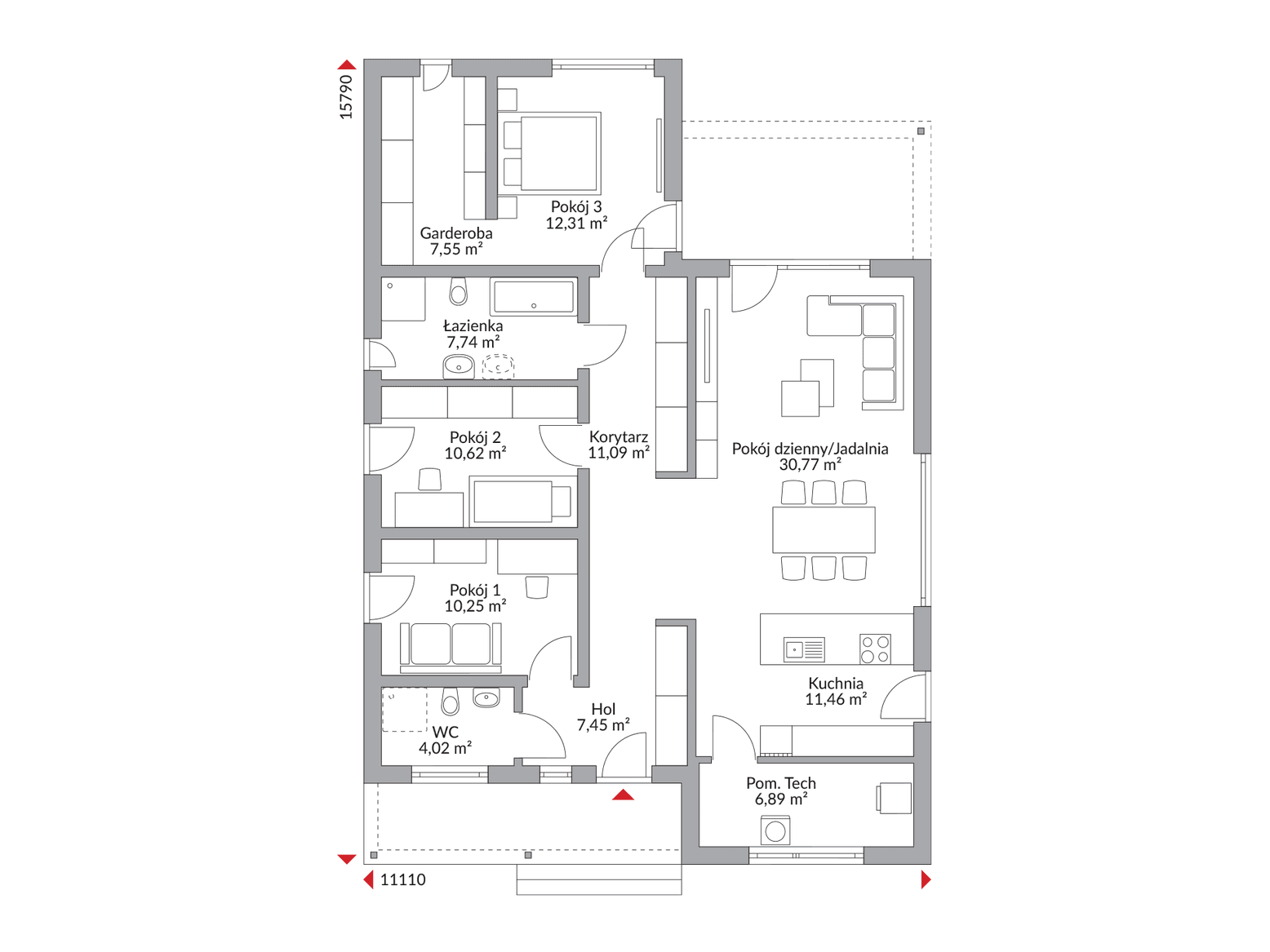 Ten parterowy bungalow to mistrzostwo w organizacji przestrzeni. Wnętrze wita Cię imponującą, otwartą strefą dzienną, gdzie salon, jadalnia i kuchnia tworzą jedno, pulsujące życiem centrum – idealne do swobodnego bycia razem i kreatywnego spędzania czasu. Trzy dodatkowe pokoje dają Ci pełną elastyczność aranżacyjną – czy to jako przytulne sypialnie, inspirujące miejsce do pracy, czy pokój hobby. Całość dopełnia komfortowa łazienka i niezbędne pomieszczenie techniczne.