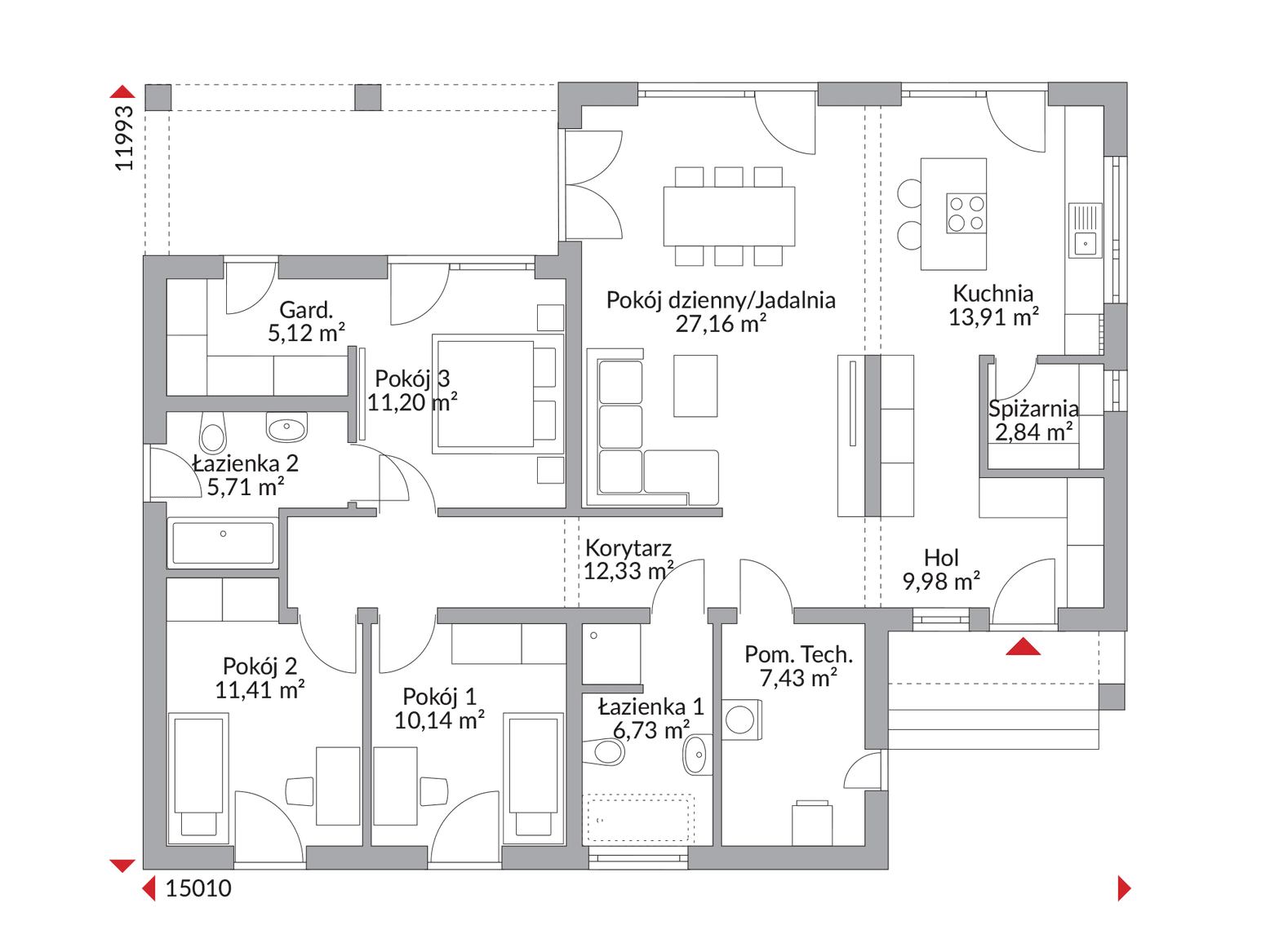 Wnętrze tego wyjątkowego bungalowa zachwyca przestronną, otwartą strefą dzienną, gdzie salon, jadalnia i kuchnia tworzą harmonijną całość, idealną do wspólnego spędzania czasu i celebrowania codzienności. Duże przeszklenia (jeśli są widoczne na wizualizacjach/planie) wpuszczają mnóstwo naturalnego światła, tworząc ciepłą i przyjazną atmosferę. Ale to nie wszystko! Perfect 124.1 oferuje aż trzy komfortowe sypialnie oraz dwie funkcjonalne łazienki, co zapewnia prywatność i wygodę wszystkim domownikom – rzadkość w domach parterowych tej wielkości! Całość dopełnia niezbędne pomieszczenie techniczne.