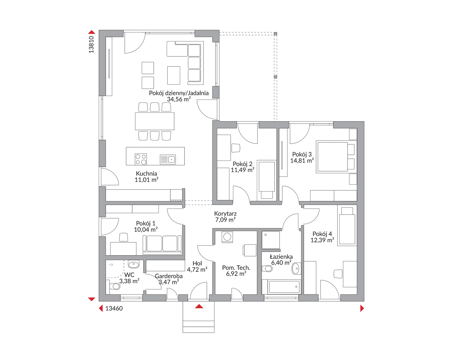 Przestronny salon z jadalnią i otwartą kuchnią stanowi serce tego wyjątkowego projektu domu. To idealne miejsce na rodzinne spotkania, celebracje i codzienne chwile relaksu, skąpane w naturalnym świetle. Aż pięć pokoi (w tym cztery komfortowe sypialnie) zapewnia każdemu domownikowi własną przestrzeń, a funkcjonalna łazienka i praktyczne pomieszczenie techniczne dopełniają całości, gwarantując wygodę na każdym kroku.