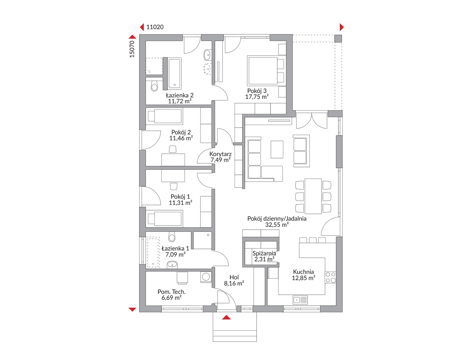 Sercem tego wyjątkowego projektu domu parterowego jest duży, jasny salon połączony z jadalnią i otwartą kuchnią. To idealnie zaprojektowana przestrzeń do wspólnego spędzania czasu, rodzinnych posiłków i przyjmowania gości. Dom Perfect 129 oferuje aż trzy komfortowe sypialnie (cztery pokoje ogółem), zapewniając prywatność każdemu członkowi rodziny. Dodatkowym atutem są dwie w pełni funkcjonalne łazienki, które podnoszą komfort codziennego użytkowania. Całość dopełnia praktyczne pomieszczenie techniczne.