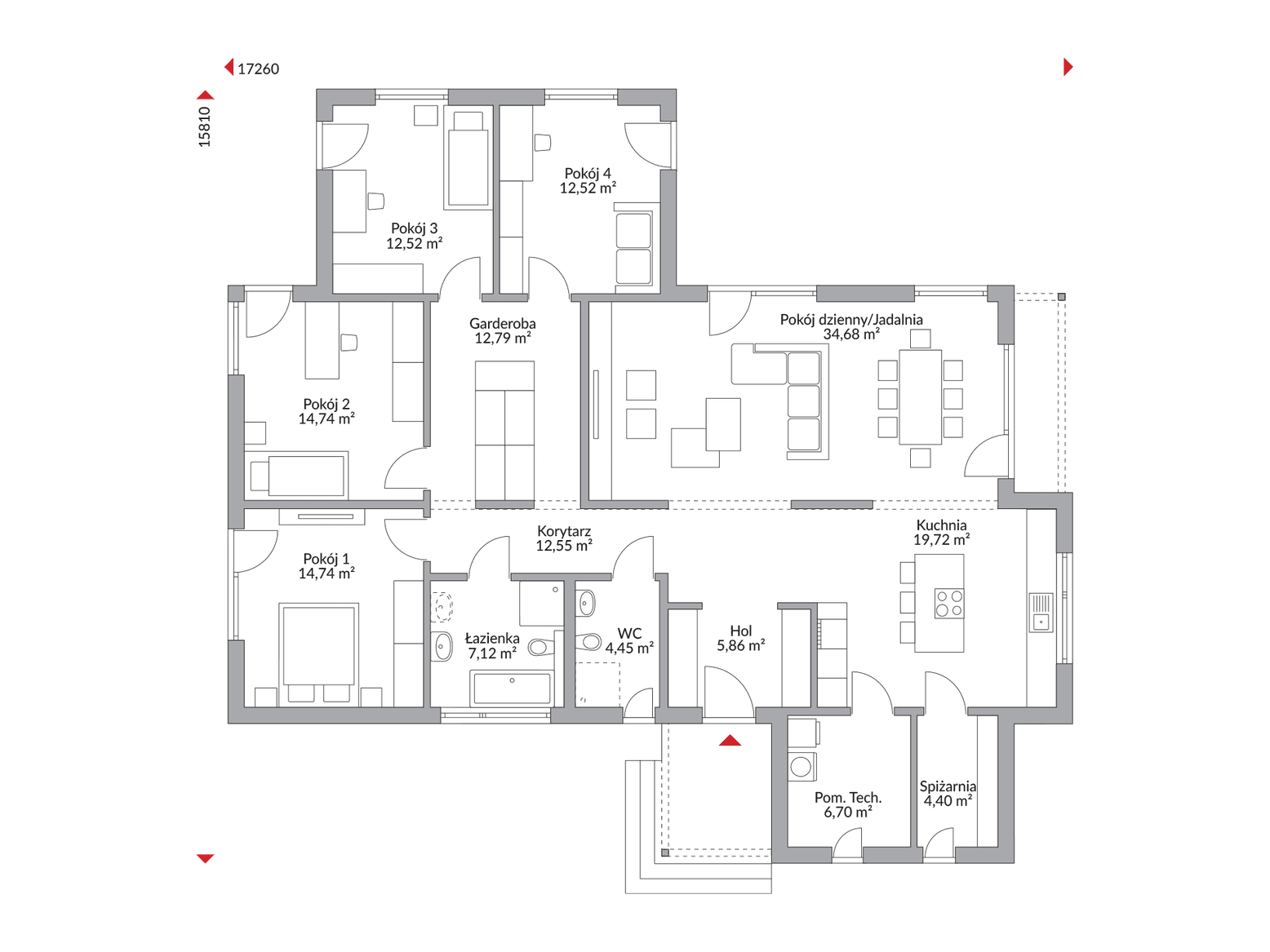 Centralnym punktem tego imponującego projektu domu parterowego jest niezwykle przestronny, pełen naturalnego światła salon, harmonijnie połączony z jadalnią oraz otwartą kuchnią z praktyczną spiżarnią. Ta otwarta, doskonale doświetlona strefa dzienna to idealne miejsce do rodzinnego życia, organizacji przyjęć i codziennego relaksu. Dom Perfect 163.1 oferuje aż cztery komfortowe pokoje, zapewniając każdemu domownikowi własną przestrzeń. Funkcjonalność podkreślają duża łazienka, dodatkowe WC, pojemna garderoba oraz niezbędne pomieszczenie techniczne.