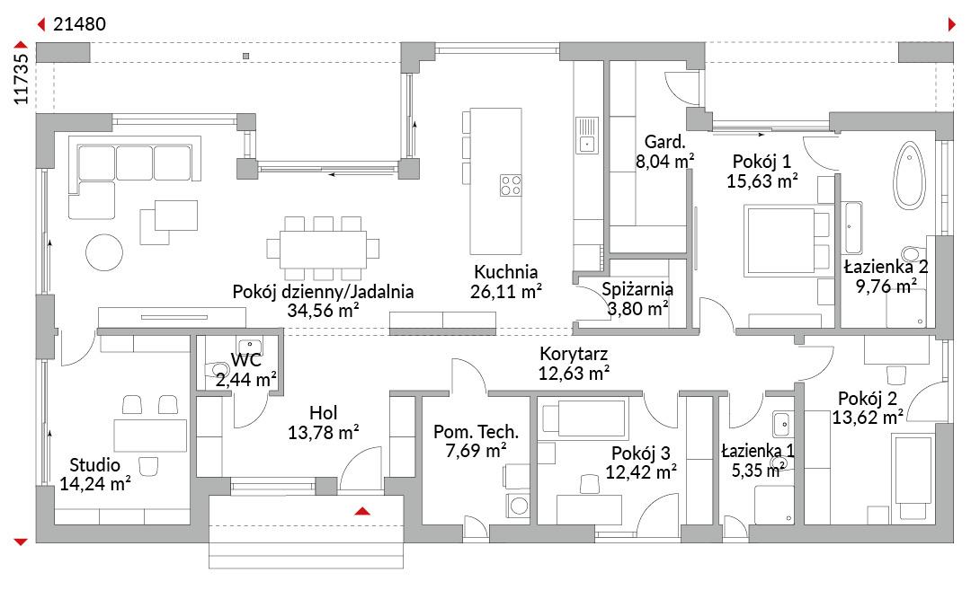 Parterowy dom z cofniętym, zadaszonym wejściem i wyższymi drzwiami wejściowymi. Taras ogrodowy osłonięty okapem dachu. Przestronna część dzienna z podwyższonymi oknami, otwartą kuchnią i spiżarnią, jadalnią i salonem z wyjściem do ogrodu. Oddzielne studio do pracy zdalnej lub jako pokój gościnny. Trzy sypialnie, w tym jedna z łazienką i garderobą. Wszystkie sypialnie z wyjściem na zewnątrz. Dodatkowa łazienka z prysznicem oraz toaleta dla gości. Pomieszczenie techniczne i hol.