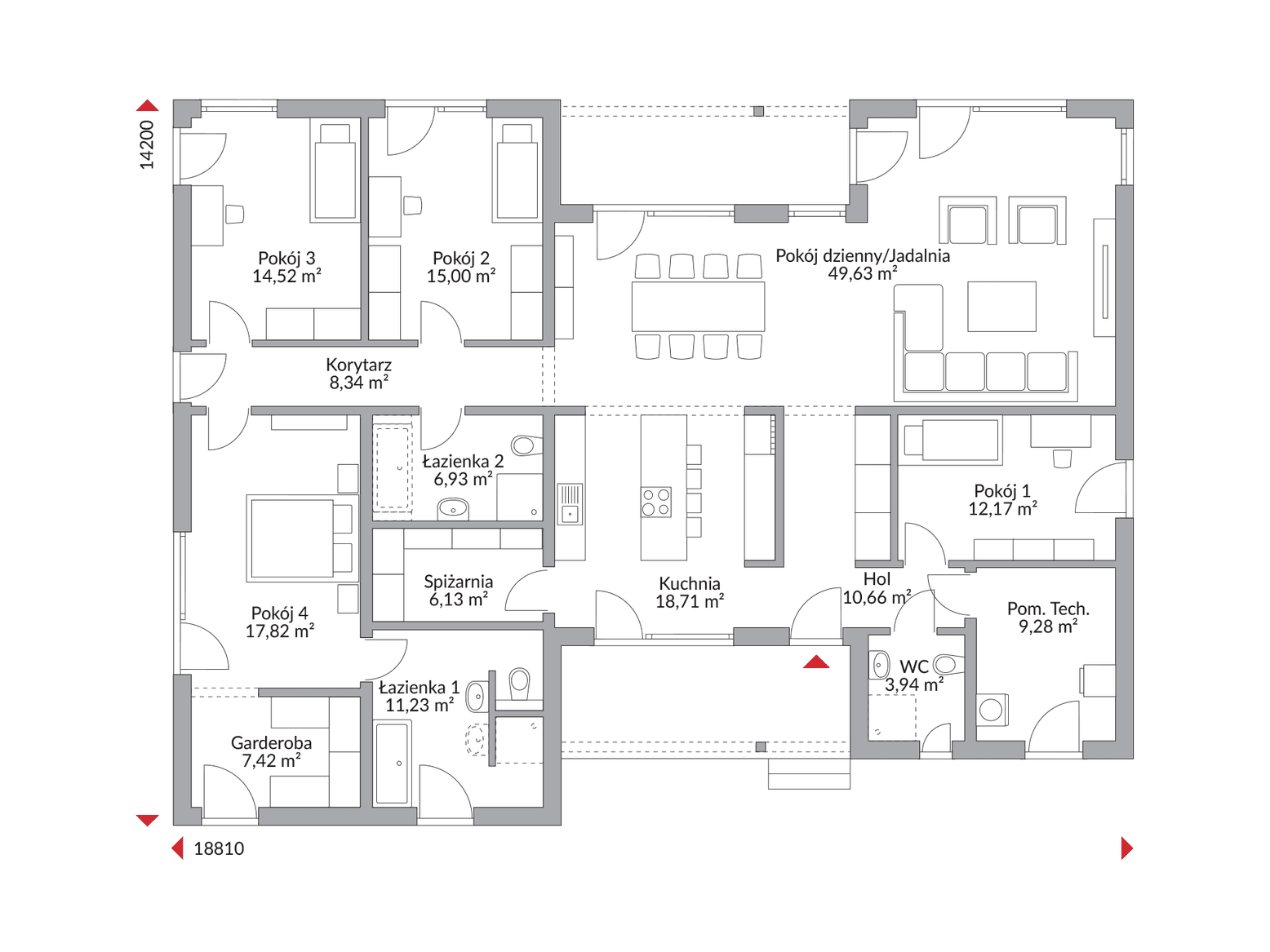 Sercem tej okazałej rezydencji parterowej jest imponujący, skąpany w świetle salon, harmonijnie połączony z jadalnią oraz otwartą kuchnią z praktyczną spiżarnią. Ta niezwykle przestronna, doskonale doświetlona strefa dzienna to idealne miejsce do reprezentacyjnego przyjmowania gości, rodzinnego życia i codziennego relaksu. Dom Perfect 192 oferuje aż cztery komfortowe sypialnie, z których główna sypialnia zachwyca własną, przestronną garderobą, tworząc luksusową strefę prywatności. Niezrównany komfort zapewniają dwie w pełni funkcjonalne łazienki, dodatkowe WC oraz niezbędne pomieszczenie techniczne.