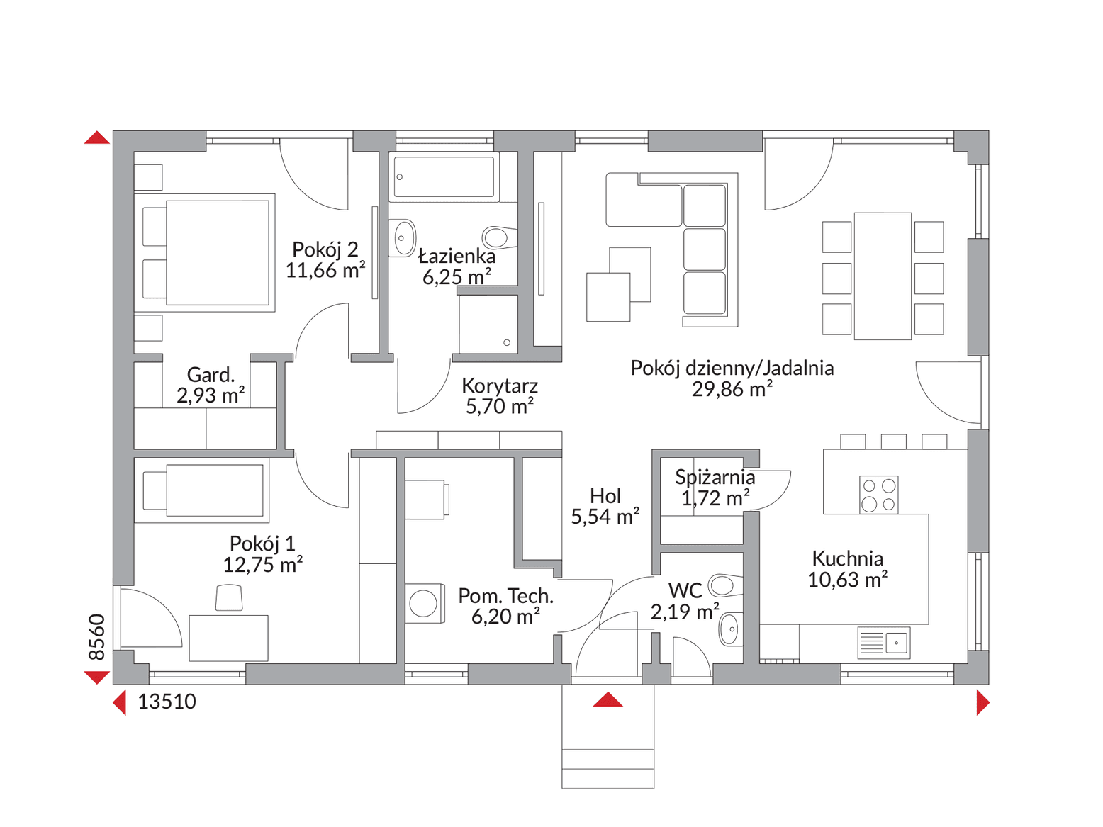 Sercem tego małego domu parterowego jest jasna i przestronna jak na swój metraż otwarta strefa dzienna, łącząca salon, jadalnię oraz funkcjonalną kuchnię z praktyczną spiżarnią. To idealnie zaprojektowane miejsce do codziennego życia, relaksu i przyjmowania gości. Dom Perfect 95 oferuje dwa komfortowe pokoje (łącznie trzy pokoje), które świetnie sprawdzą się jako sypialnia i gabinet lub pokój dla dziecka. Całość dopełniają dobrze rozplanowana łazienka oraz niezbędne pomieszczenie techniczne.