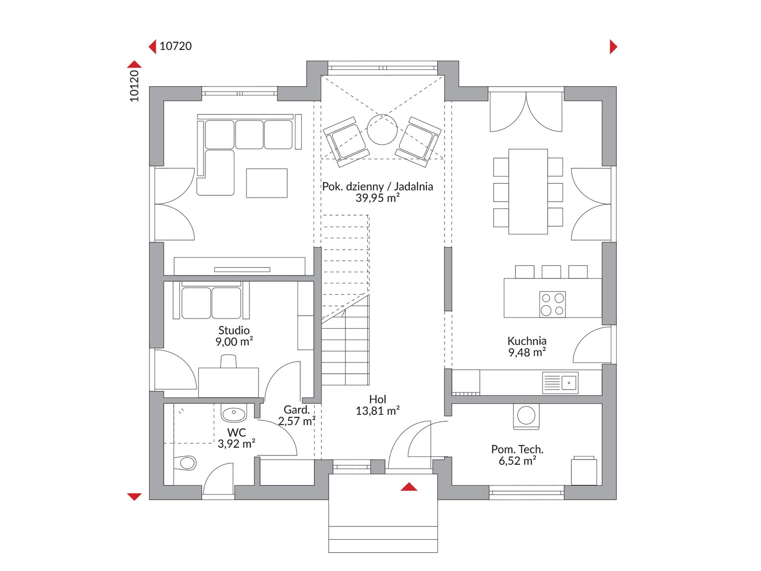 Parter domu Alpha 162.1 wita Cię przestronnym holem z praktyczną szatnią. Sercem domu jest jasna, otwarta kuchnia, która płynnie łączy się z obszernym salonem i jadalnią, tworząc idealne miejsce do wspólnego życia, przyjmowania gości i celebrowania każdej chwili. Funkcjonalność tego poziomu podkreślają również wygodna toaleta dla gości oraz niezbędne pomieszczenie techniczne.
