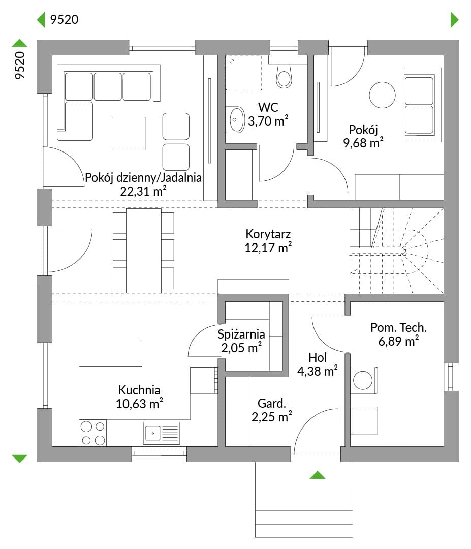Dokładnie tak wyglądają marzenia o własnym domu ze spadzistym dachem i romantycznym poddaszem. Zgodnie ze znanym powiedzeniem kto ma porządek w domu ten ma również porządek w życiu. A nasz niezwykle funkcjonalny projekt z dwoma pomieszczeniami gospodarczymi oraz spiżarnią przyległą do kuchni pozwala znaleźć miejsce na wszystkie potrzebne produkty, przetwory, sprzęty i narzędzia domowe.