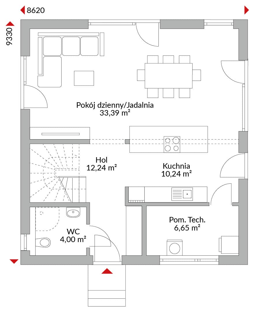 Parter domu Point 128.2 to przestrzeń stworzona z myślą o komforcie i integracji. Duży salon, połączony z jadalnią i otwartą kuchnią, tworzy serce domu – idealne miejsce do wspólnego spędzania czasu, rodzinnych posiłków i przyjmowania gości. Przemyślany układ tego poziomu obejmuje również wygodną toaletę dla gości oraz niezbędne pomieszczenie techniczne.