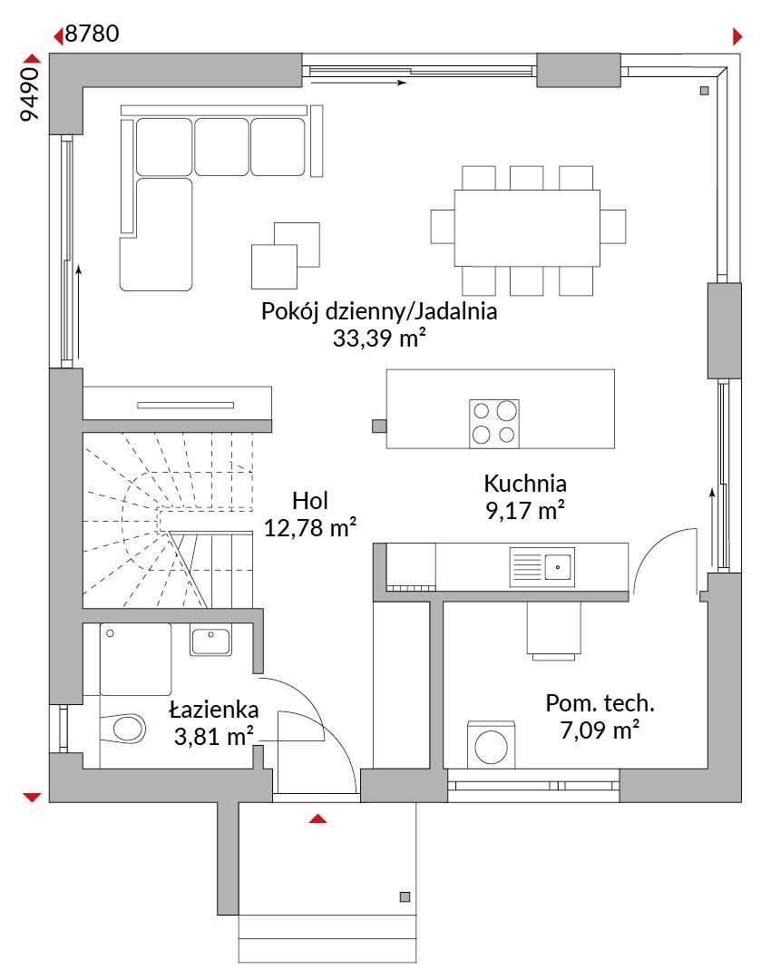 Dom 1,5-kondygnacyjny z zadaszeniem wejścia. Dwa pokoje na piętrze. Główna sypialnia z dużą garderobą. Podwyższony parter z narożnym przeszkleniem i wyższymi oknami zaprojektowany jako otwarta przestrzeń dzienna: kuchnia, salon i jadalnia z wyjściem przez drzwi przesuwne na taras. WC dla gości z prysznicem, łazienka z wanną, prysznicem i podwójną umywalką, pomieszczenie techniczne oraz wiatrołap, hol. Dach dwuspadowy z szerokim okapem 60 cm, nachylenie 40°, ścianka kolankowa 1 m.