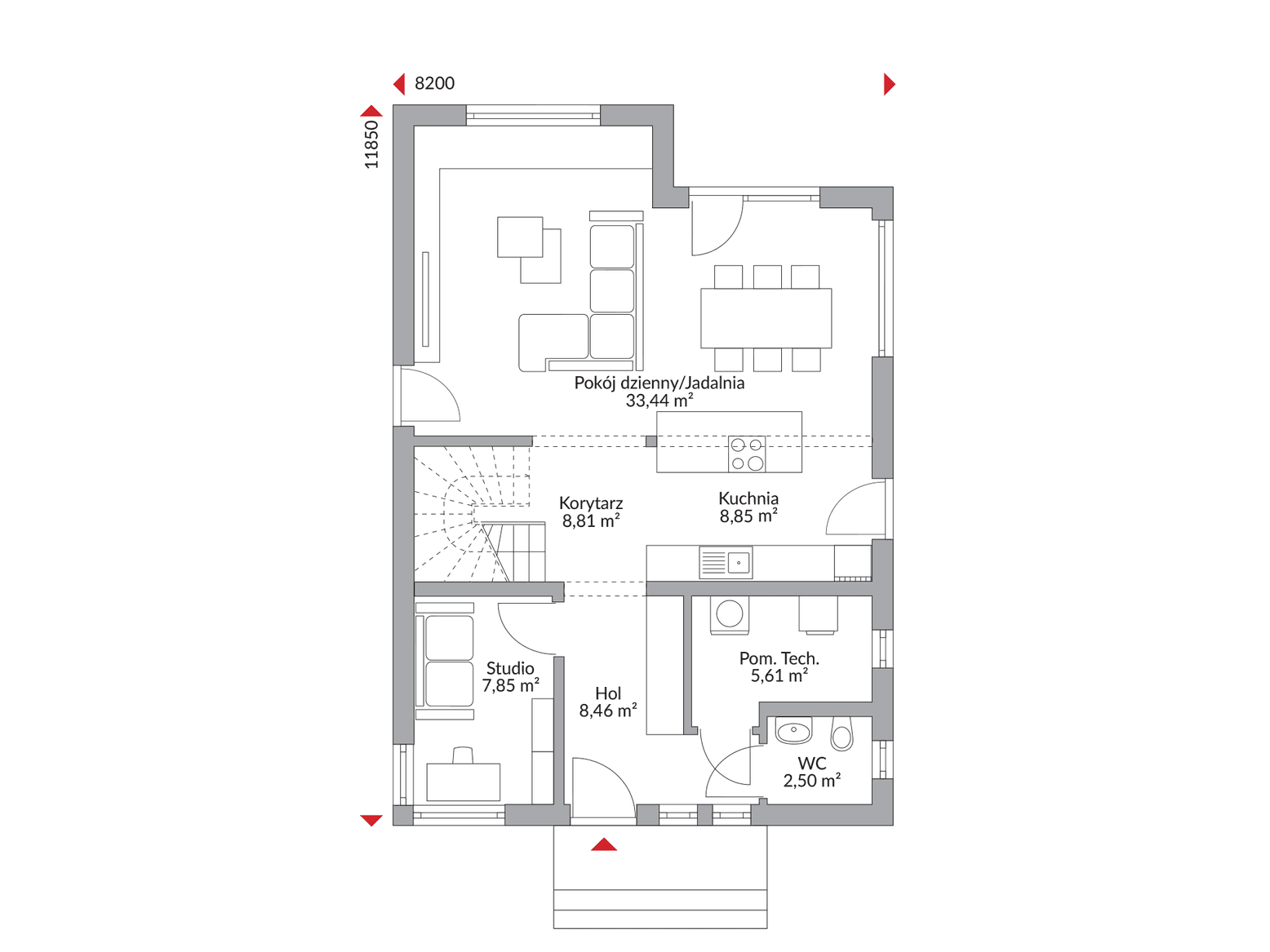 Parter domu Point 143 to serce Twojego codziennego życia. Otwarta kuchnia naturalnie łączy się z przestronnym salonem i jadalnią, tworząc jasną i przyjazną strefę dzienną, idealną do wspólnego spędzania czasu i rodzinnych spotkań. Funkcjonalność tego poziomu podkreślają również wygodny hol, toaleta dla gości oraz niezbędne pomieszczenie techniczne.