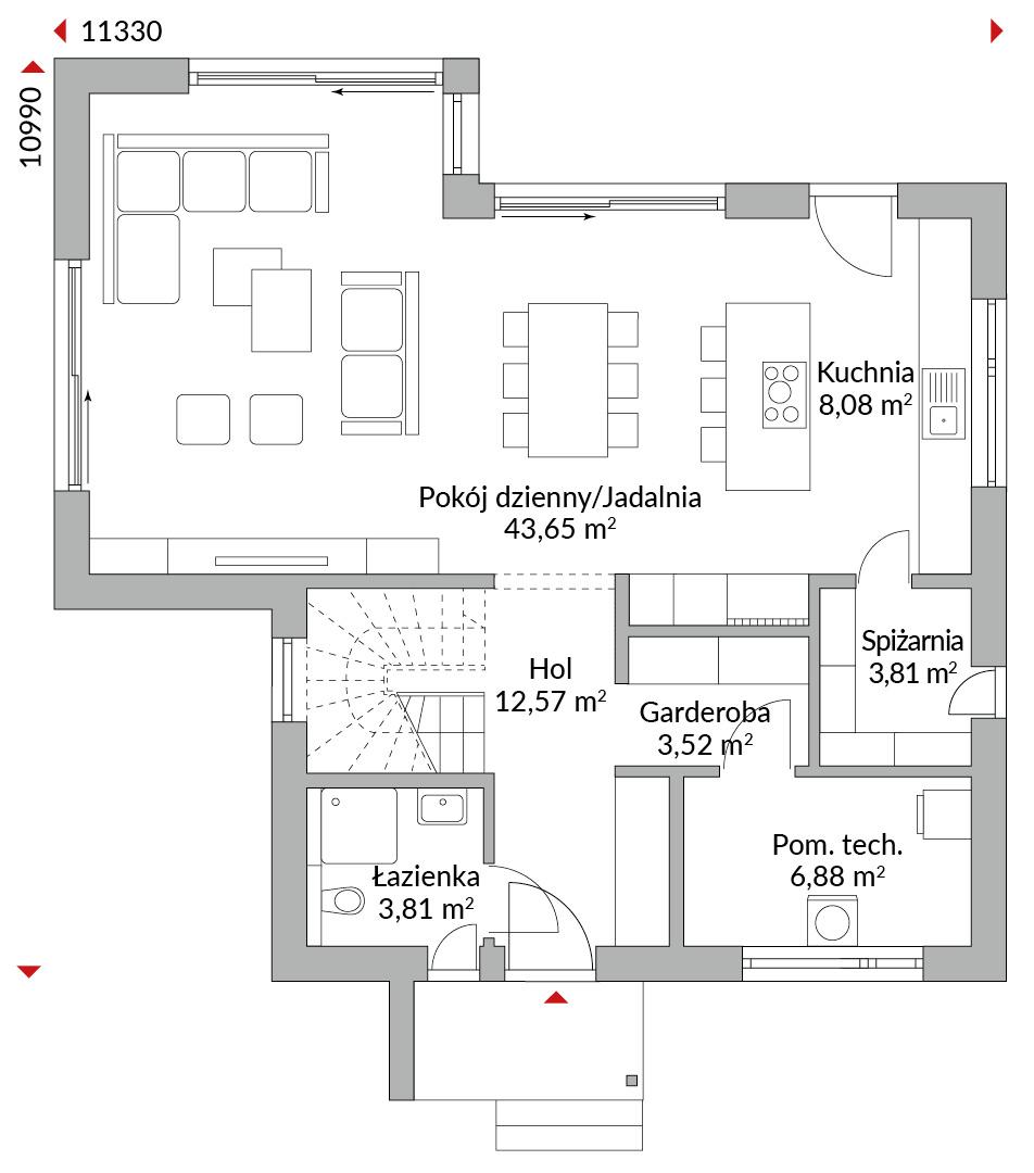 Dom 1,5-kondygnacyjny, z zadaszeniem wejścia i wyższymi drzwiami frontowymi. Dwa pokoje na piętrze. Wysokie przeszklenia z balkonami francuskimi ze szkła. Główna sypialnia z przestronną garderobą. Podwyższony parter z przeszklonym wykuszem narożnym i podwyższonymi oknami tworzy otwartą przestrzeń dzienną z kuchnią, salonem i jadalnią oraz drzwiami przesuwnymi na taras. WC dla gości z prysznicem, łazienka z wanną, prysznicem i podwójną umywalką, pomieszczenie techniczne, wiatrołap z miejscem na garderobę, hol. Dach dwuspadowy z szerokim okapem 60 cm, nachylenie 30°, ścianka kolankowa 1,5 m.