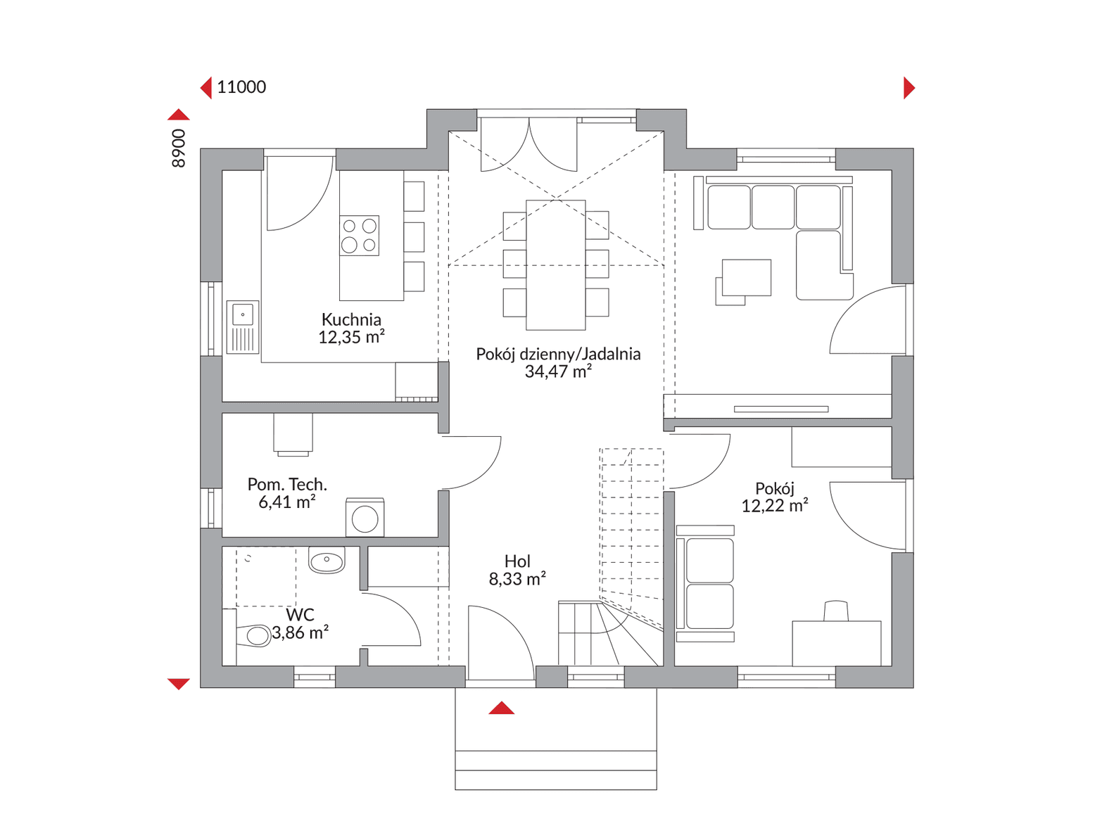 Parter domu Point 145 to serce Twojego codziennego życia. Otwarta kuchnia naturalnie łączy się z przestronnym salonem i jadalnią, tworząc jasną i przyjazną strefę dzienną, idealną do wspólnego spędzania czasu i rodzinnych spotkań. Funkcjonalność tego poziomu podkreślają również wygodny hol, toaleta dla gości oraz niezbędne pomieszczenie techniczne.