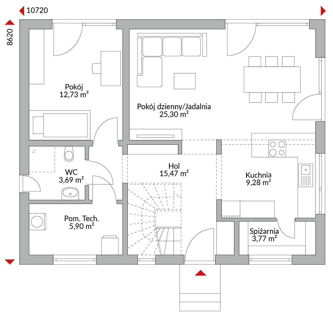 Parter domu Point 151 to serce Twojego domowego życia. Przestronny salon, połączony z jadalnią oraz otwartą kuchnią z praktyczną spiżarnią, tworzy jasną i przyjazną strefę idealną do wspólnego spędzania czasu. Kluczowym atutem tego projektu domu jest dodatkowy pokój zlokalizowany na parterze, oferujący wszechstronne możliwości – może służyć jako pokój gościnny, gabinet, lub komfortowa sypialnia dla domownika ceniącego wygodę bez schodów. Funkcjonalność parteru podkreślają również wygodna toaleta (WC) oraz niezbędne pomieszczenie techniczne.