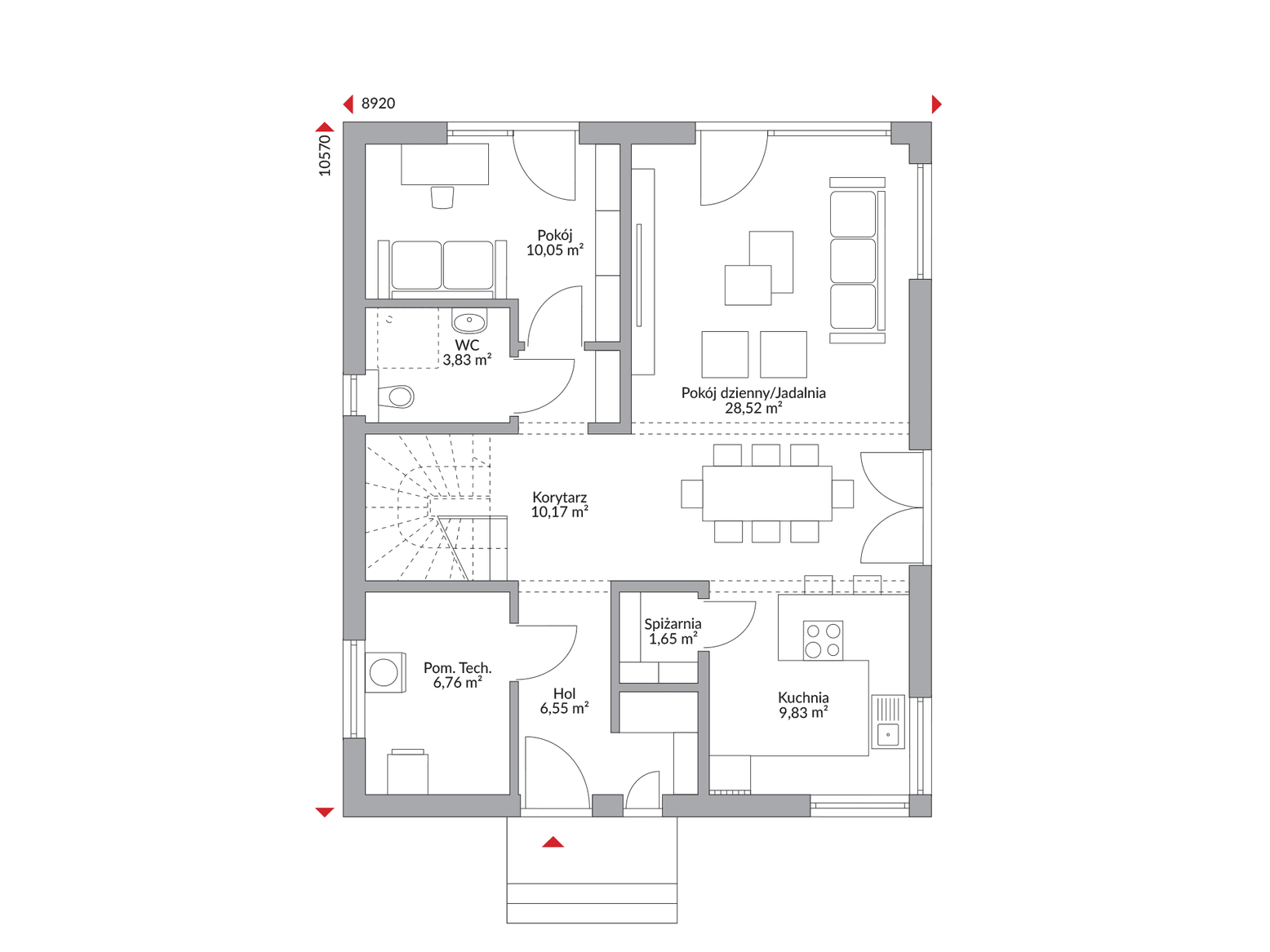 Parter domu Point 153 wita Cię przestronnym holem i korytarzem. Sercem domu jest jasna, otwarta kuchnia z praktyczną spiżarnią, która płynnie łączy się z obszernym salonem i jadalnią, tworząc idealne miejsce do wspólnego życia, przyjmowania gości i celebrowania każdej chwili. Funkcjonalność tego poziomu podkreślają również wygodna toaleta dla gości oraz niezbędne pomieszczenie techniczne.